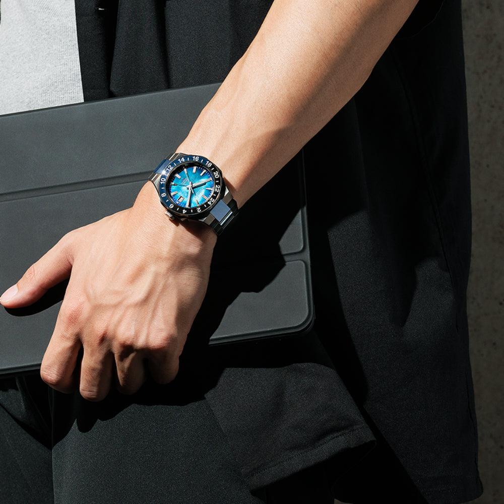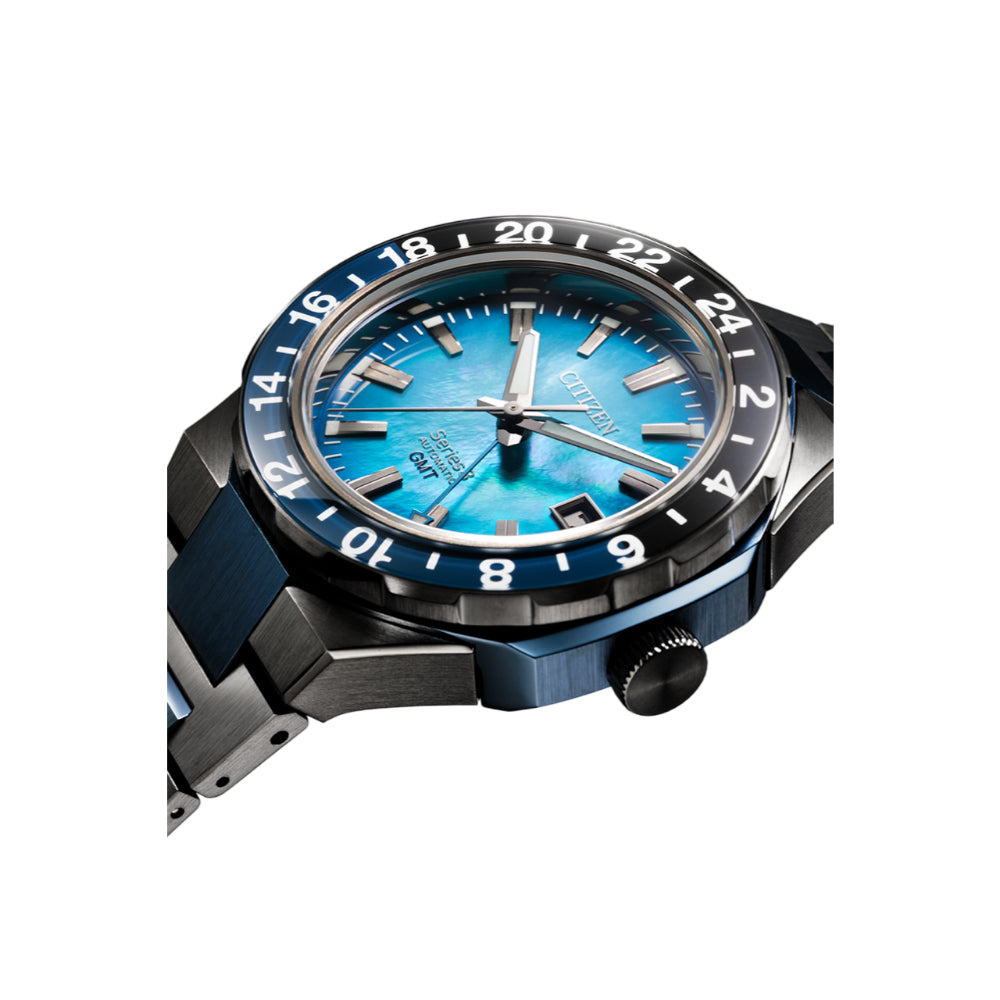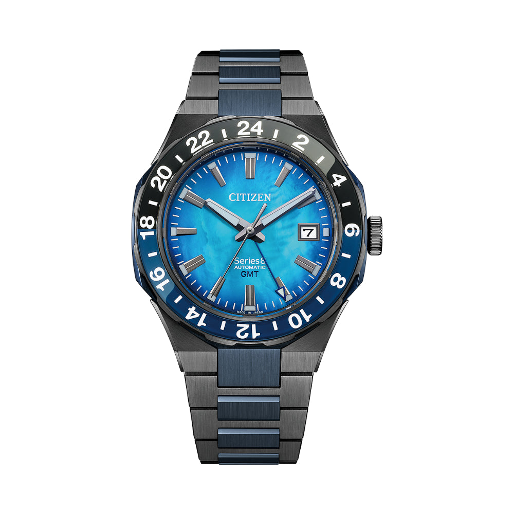 Functional and practical, modern and sporty –– the new Citizen Series8 880 GMT is the perfect companion for daily wear to spirited travel, and everything in between. Featuring a black and blue two-tone stainless steel case with a bi-directional bezel, the 41mm model highlights the best of Citizen's creative watchmaking and finishing techniques.