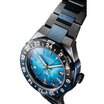 A tapered, integrated stainless steel H-link bracelet secures the watch to the wrist, with its two-tone design following the aesthetic of the case via the use of polished and brushed facets. Beneath a sapphire crystal, the watch's blue mother-of-pearl dial features applied indices and lume-filled hands, each working together to offer incredible legibility alongside a utility-driven 3 o'clock date window; a green-tipped hand assists in keeping track of multiple time zones.