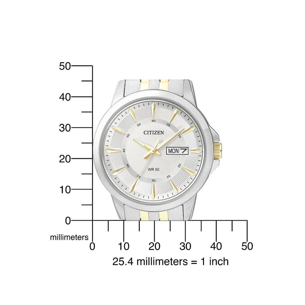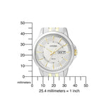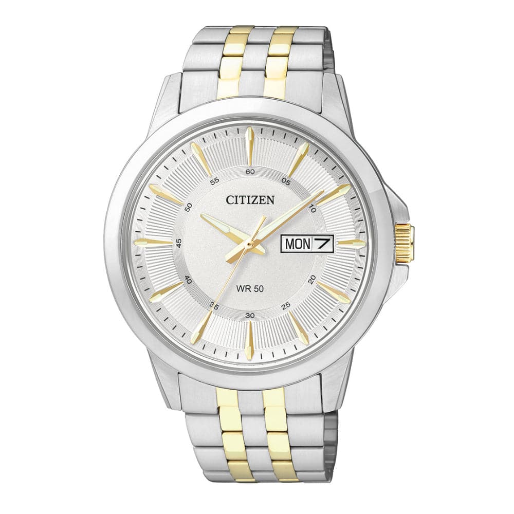 Come back to the originals, this Day and Date Citizen Quartz watch is a classic reinvention, the large Day and Date window, the circular pattern on the dial running along the minute tracker and the asymmetrical kite shaped indexes are the distinguishing features of this super popular style. Features a silver dial and a two tone Stainless Steel multilink bracelet. Citizen Quartz watches are powered by high precision Quartz movement, which is Made in Japan, they are extremely reliable and have very low Maintenance to give you accurate timekeeping effortlessly.