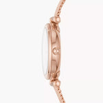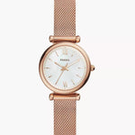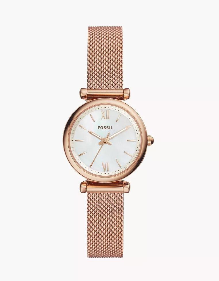 Up the glam factor with Carlie, our impeccable timepiece. This 28mm Carlie Mini features a mother-of-pearl dial with Roman numerals, three-hand movement and stainless steel rose gold-tone mesh bracelet.