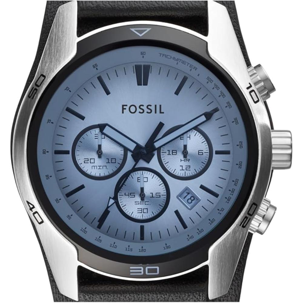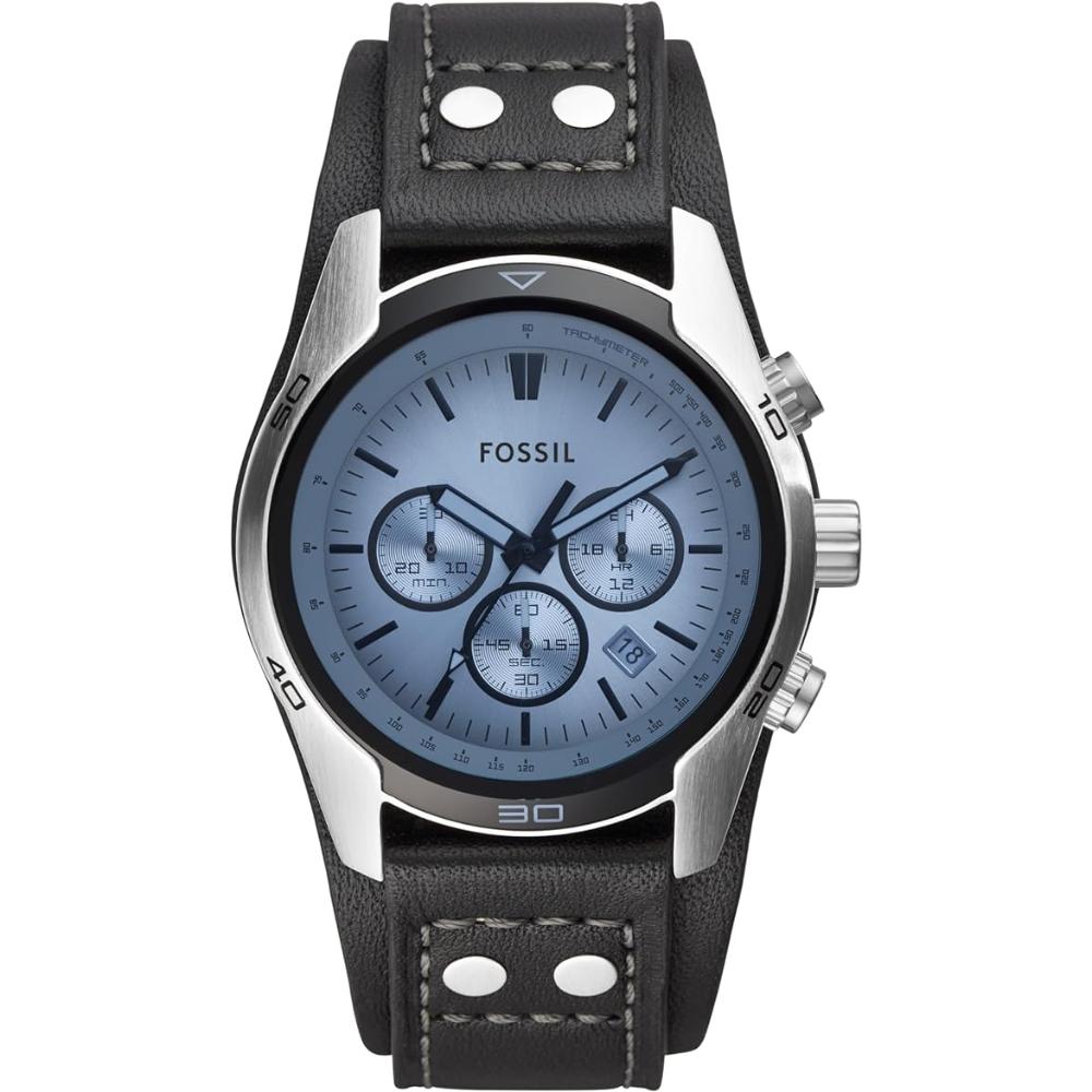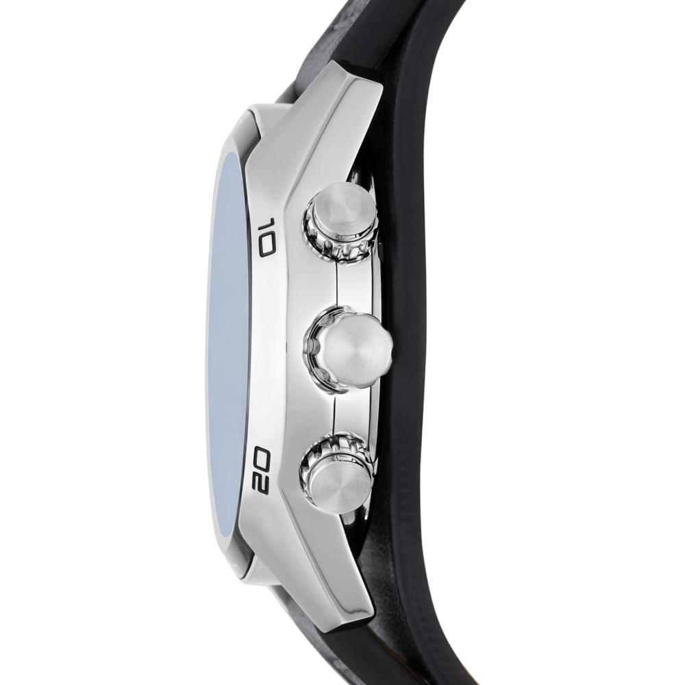 Go casual with this stainless steel watch. The silver dial features a blue crystal and chronograph movement adds extra functionality. The black genuine leather strap has silver-tone stud detail and gives this watch a sporty look you'll love.