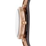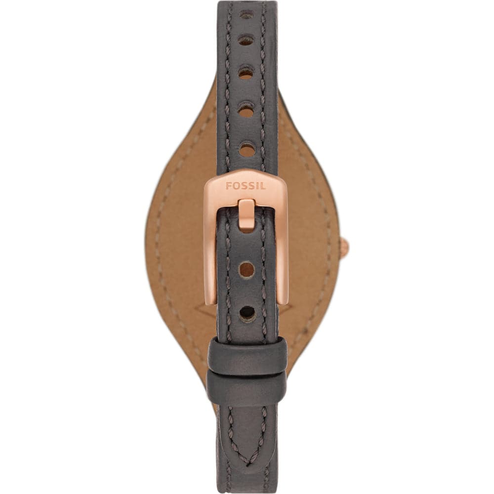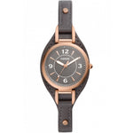 Fossil women's time only watch from the carlie collection. Watch with 28 mm case made of stainless steel with satin finish in rose gold color. The case is round in shape with a thickness of 7 mm. The glass is transparent and the dial is black. The distance between the lugs is 8 mm. Water resistance is 5 atm. The strap is in pro-planet leather with a shiny black finish. Strap with pin buckle. Movement: quartz / 3 spheres. The reference is ES5212