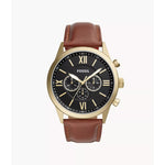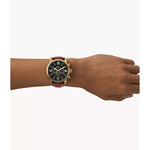 This 48mm Flynn features a black dial with Roman numerals at the 12 and six-hour marker, chronograph movement and brown leather strap.