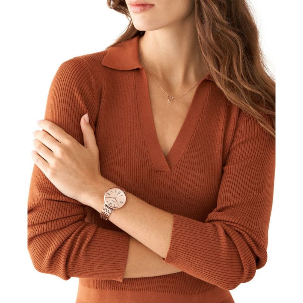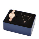 This set features a 36mm Jacqueline watch featuring a rose gold-tone textured dial, three-hand date movement, rose gold-tone stainless steel bracelet and rose gold-tone stainless steel pendant necklace and stud earrings.