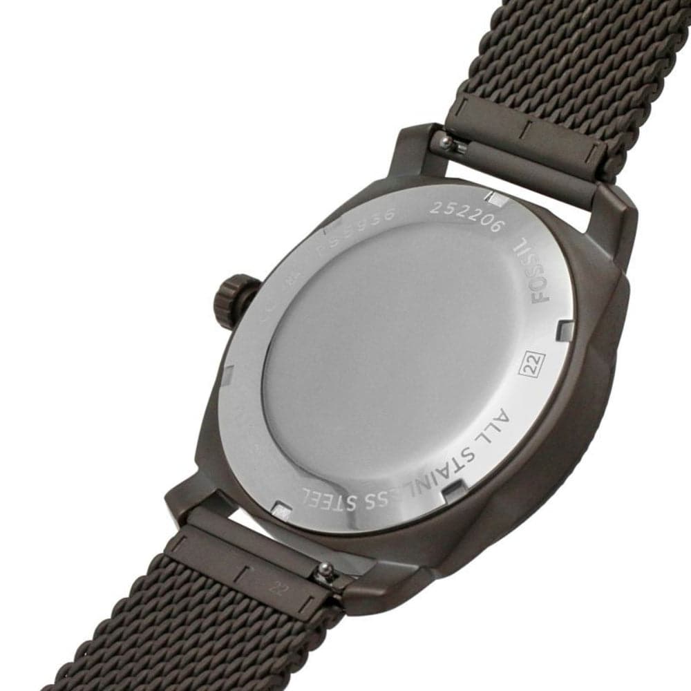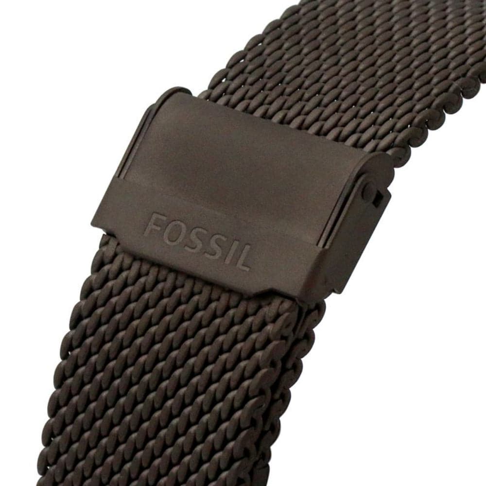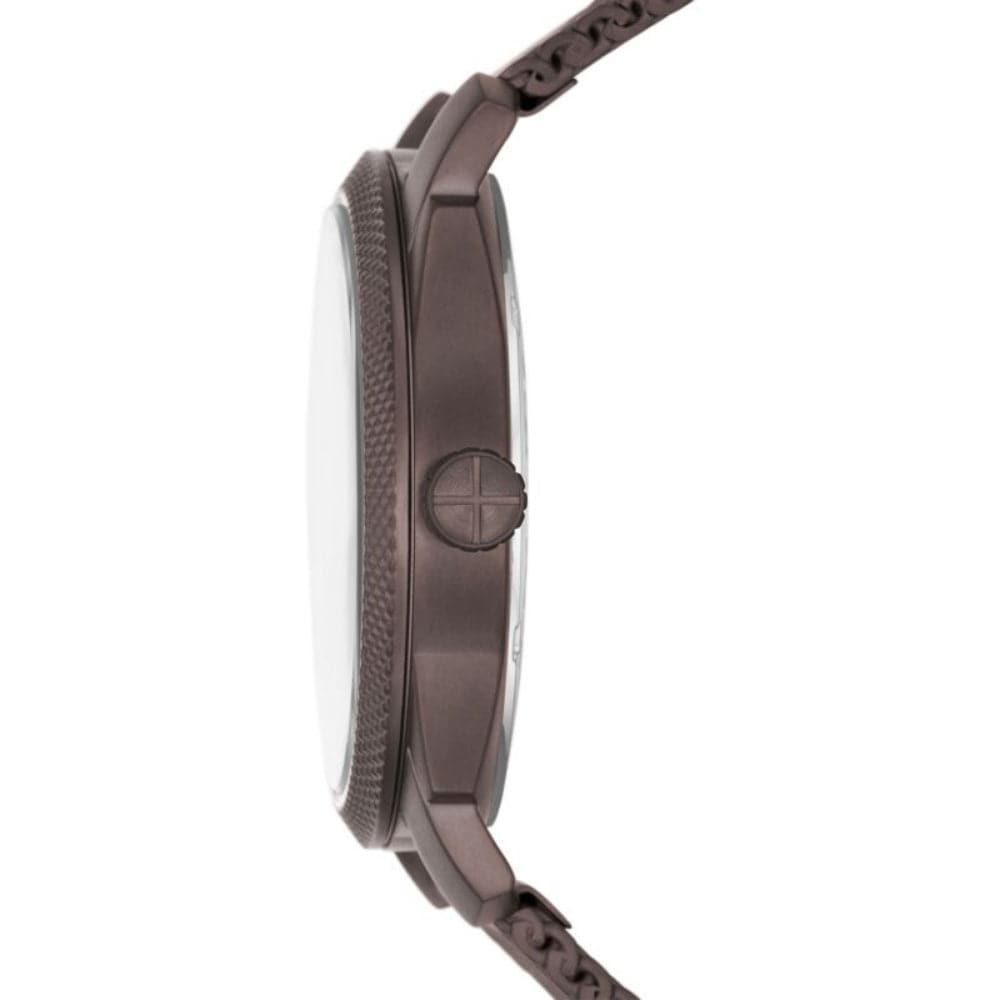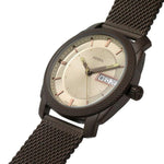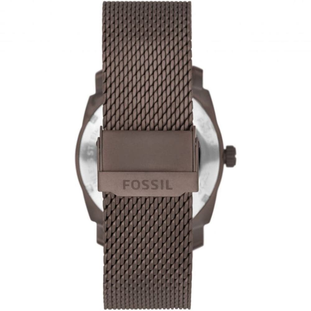 This 42mm Machine watch features a brown sunray, textured dial, three-hand day-date movement and brown stainless steel mesh strap.