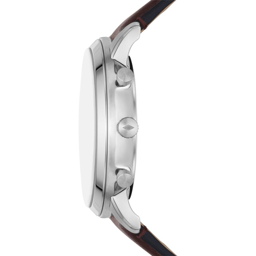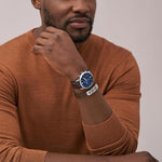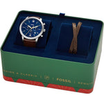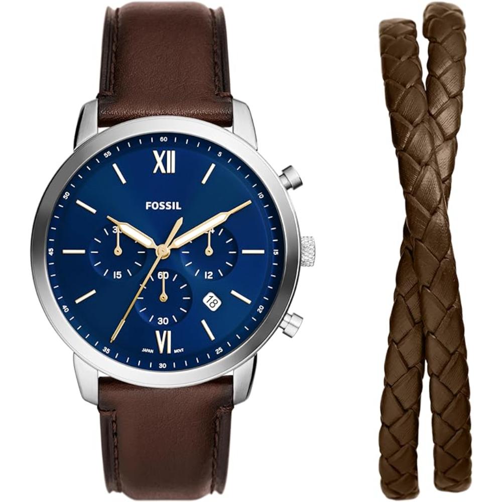 This set features a 44mm chronograph watch and a brown leather multi-strand bracelet. Fossil leather products support responsible manufacturing via the Leather Working Group.