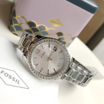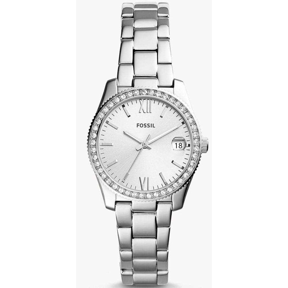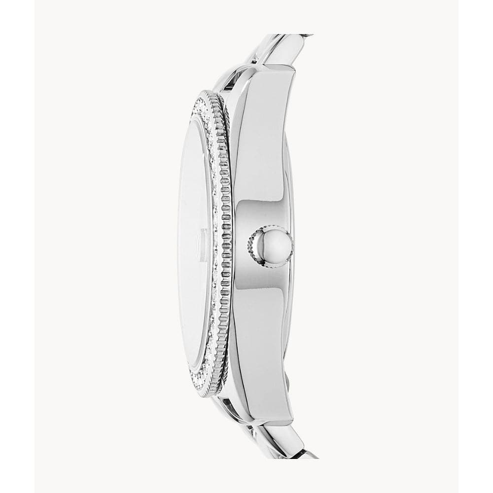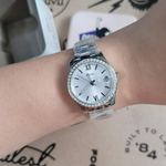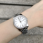 Stainless steel case with a stainless steel bracelet. Fixed stainless steel bezel set with crystals. Silver dial with luminous silver-tone hands and index hour markers. Roman numerals mark the 6 and 12 o'clock positions. Minute markers around the outer rim. Dial Type: Analog. Luminescent hands and markers. Date display at the 3 o'clock position. Quartz movement. Scratch resistant mineral crystal. Pull / push crown. Solid case back. Round case shape. Case size: 32 mm. Case thickness: 10 mm. Band width: 16 mm. Fold over clasp with a safety release. Water resistant at 50 meters / 165 feet. Functions: date, hour, minute, second. Dress watch style.