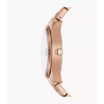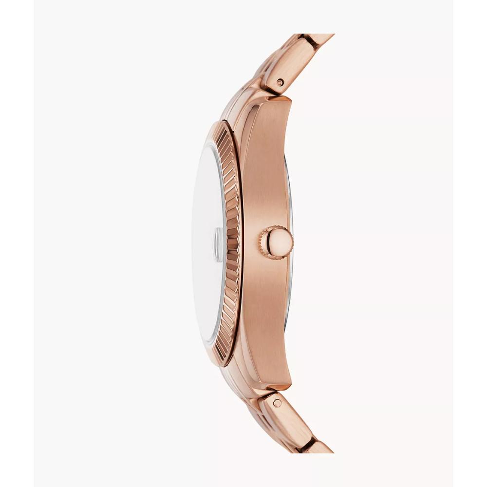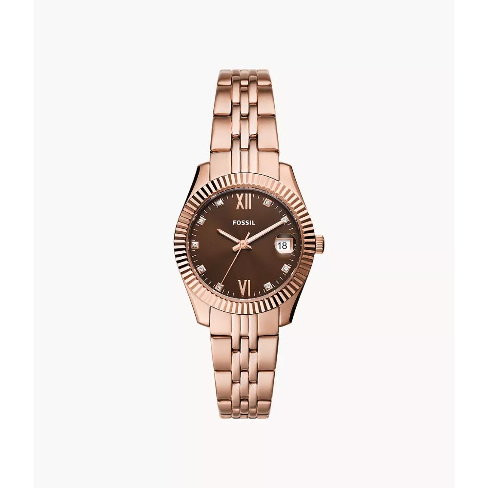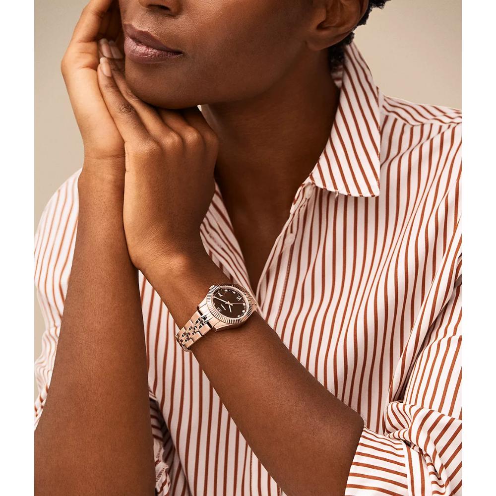 Sport-inspired Scarlette is designed for the stylish go-getter. With a brown sunray dial and our new rose-tone stainless steel bracelet and fluted topring, it has a refined look that’s suited for seizing any moment. A precision Japanese three-hand movement with date window provides the perfect amount of function.