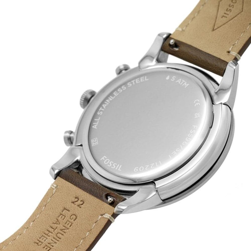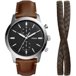 This set features a 44mm Townsman watch featuring a black satin dial, chronograph movement and brown LiteHide™ leather strap and brown leather multi-strand bracelet.