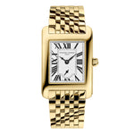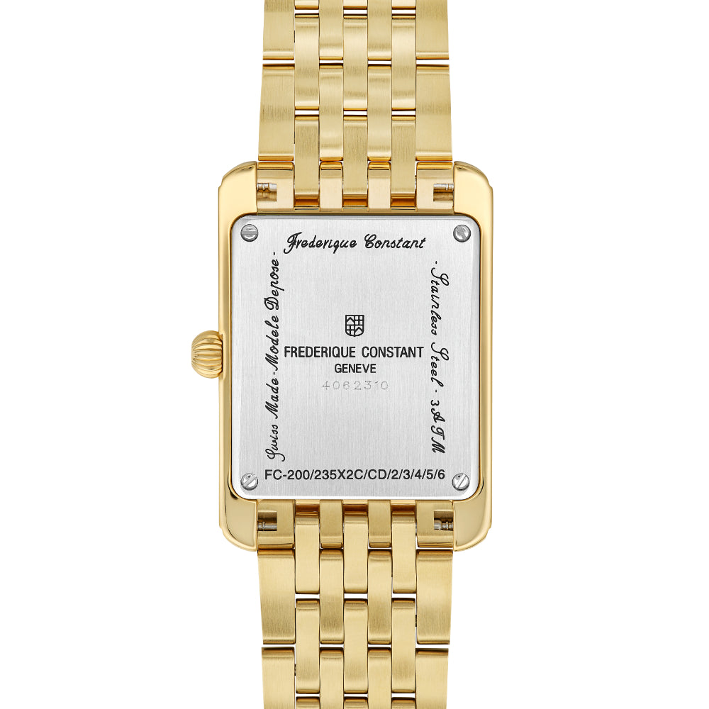 The new Classics Carrée Small Seconds collection features a 36x25mm polished gold tone stainless steel 3-part case with a silver color dial with matt finishing, black printed Roman numerals, black hour and minute hands, a small seconds counter at 6 o’clock with black hand. Set on a polished gold tone stainless steel 7-links bracelet with folding buckle.