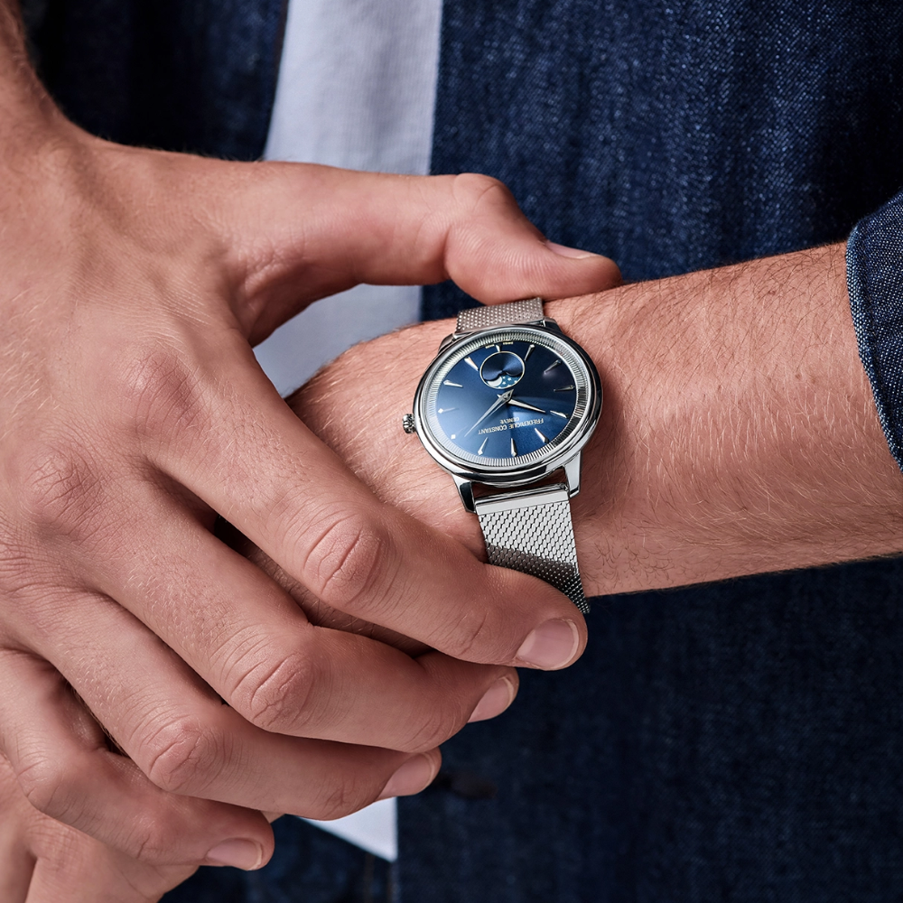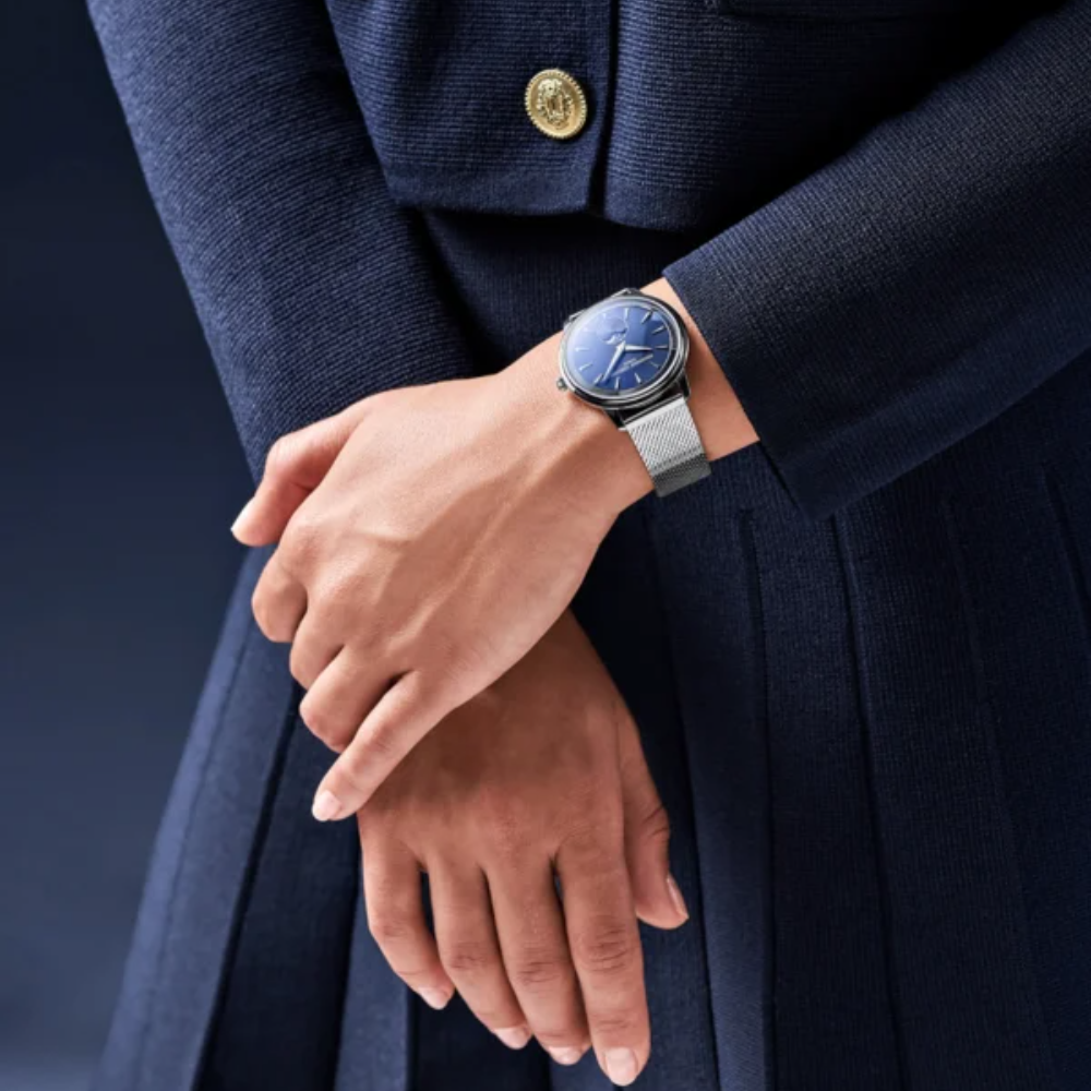The Classics Moneta Moon phase is distinguished by its quartz movement and elegant 37 mm case. It features a delicate moon phase at 6 o'clock and its name is inspired by the edge of a coin, subtly echoed on its inner bezel.