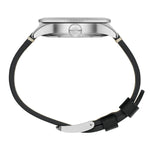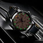 The 42mm steel case boasts all the attributes of a classic pilot’s watch including the highly legible, easy to read dial and fonts. As a nod to the traditional B-Uhr navigation watch of the 1940’s, there is a upwardly pointing triangle with two dots just below 12 o’clock, providing quick orientation and the ability to read the time at a glance. With a GMT function in the interior dial ring, the watch is powered by a Swiss-Made Quartz movement.