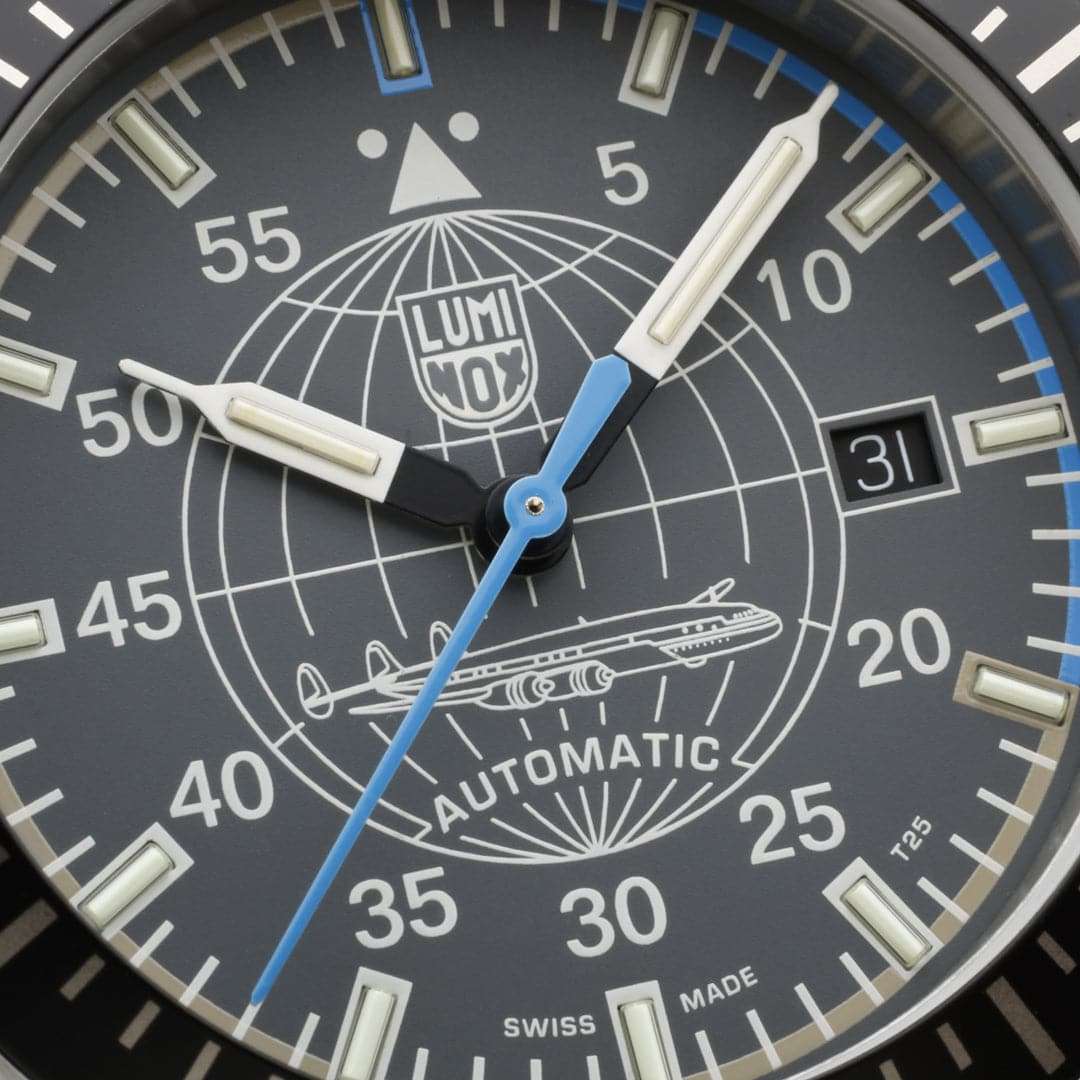Luminox is the official watch partner for the American Aerospace engineering juggernaut, Lockheed Martin. Through this partnership, Luminox takes inspiration from one of the most revolutionary airplanes of its time designed by Lockheed: the infamous CONSTELLATION®. Fondly nicknamed, Connie, the plane was a gamechanger for both civil and military aviation. The combination of high performance and design are what made this aircraft a legend in the industry, and now it inspires Luminox’s newest addition to the Air Series.The CONSTELLATION® Automatic 9600 features an elegant 3D case back, with an illustration of the globe and the CONSTELLATION® airplane on the dial. In the tradition of classical pilot’s watches, a triangle with two dots is placed at 12 o’clock to provide time at a glance and quick orientation. The Swiss made Automatic movement provides precision timing keep with a date indicator at 3 o’clock with 38-hour power reserve when fully wound.