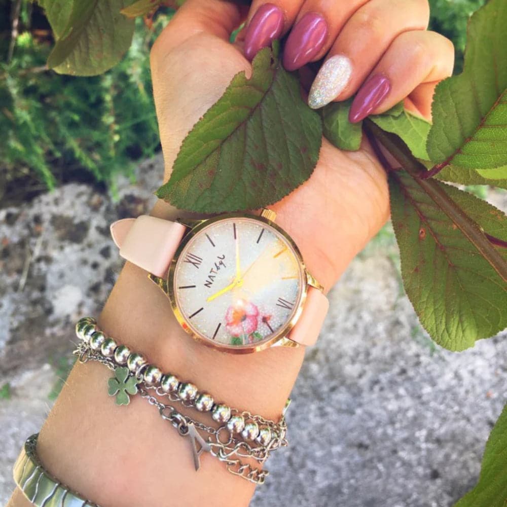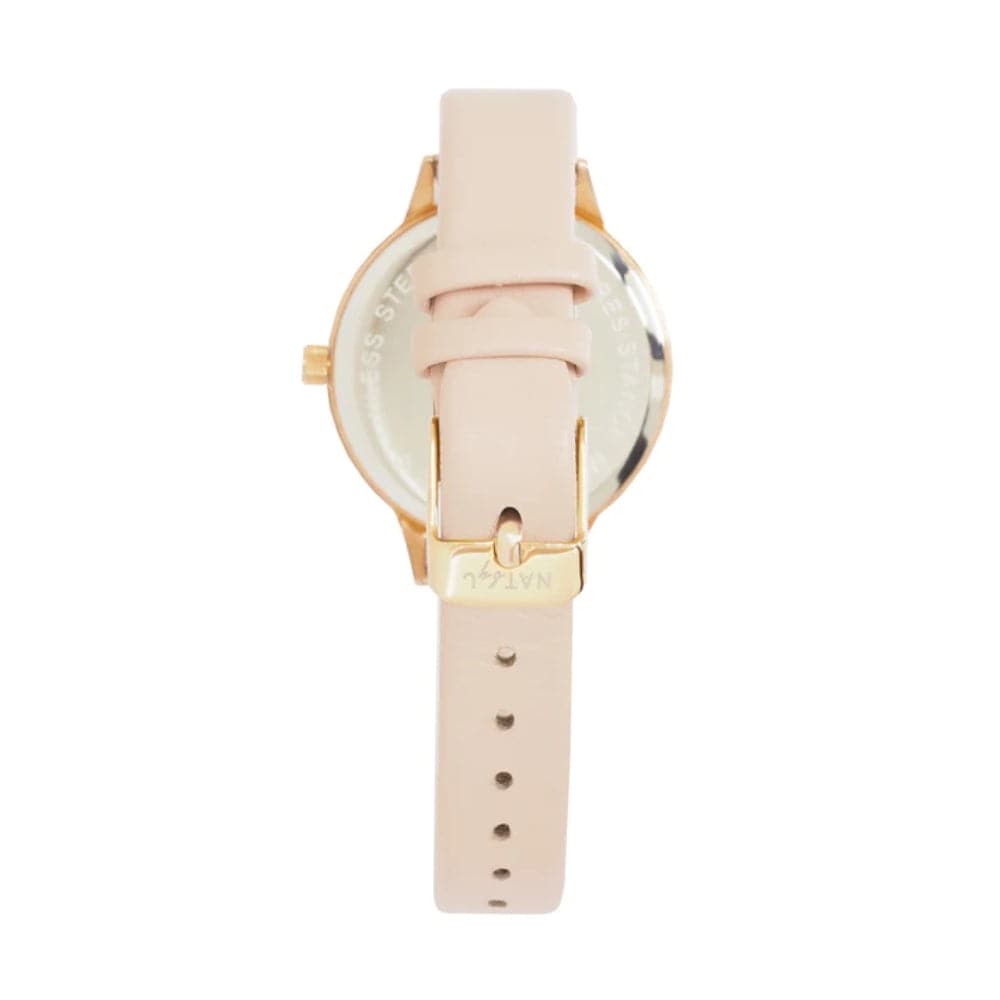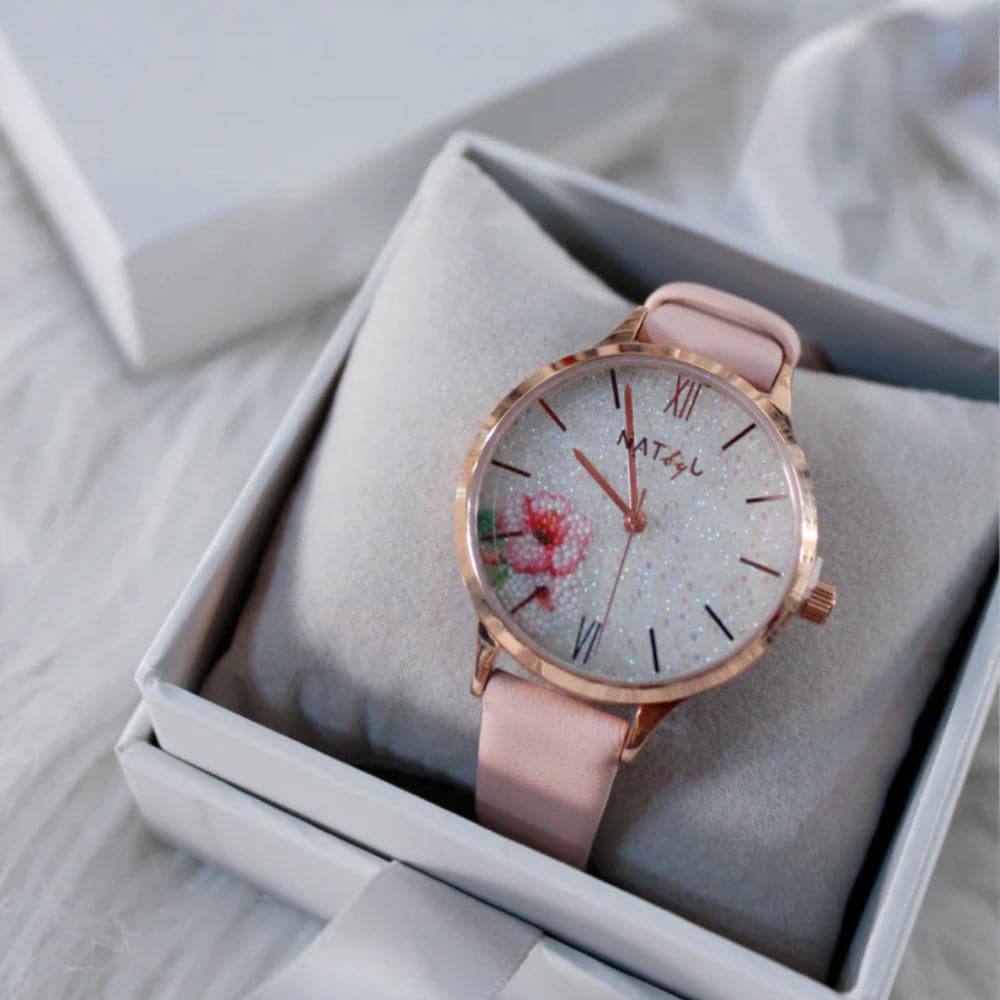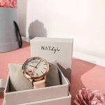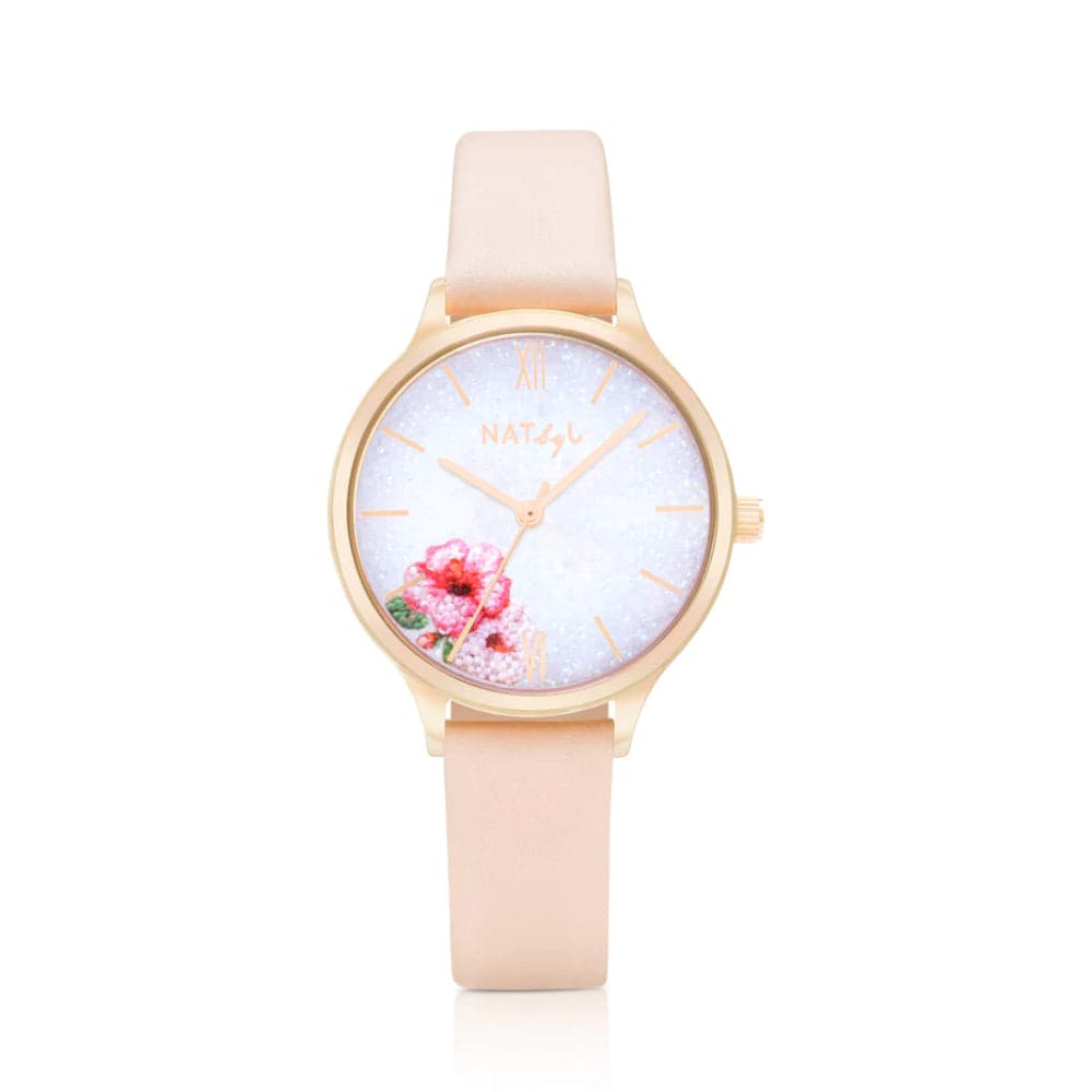 Inspired by the confidence in every woman, the NATbyJ Dazzle collection showcases beautiful sparkling pieces that glamourize and dazzle any outfit. The dial features sparkling crystal dust with a beautiful pink hibiscus flower, paired with a light pink genuine leather strap and a rose gold-plated case.