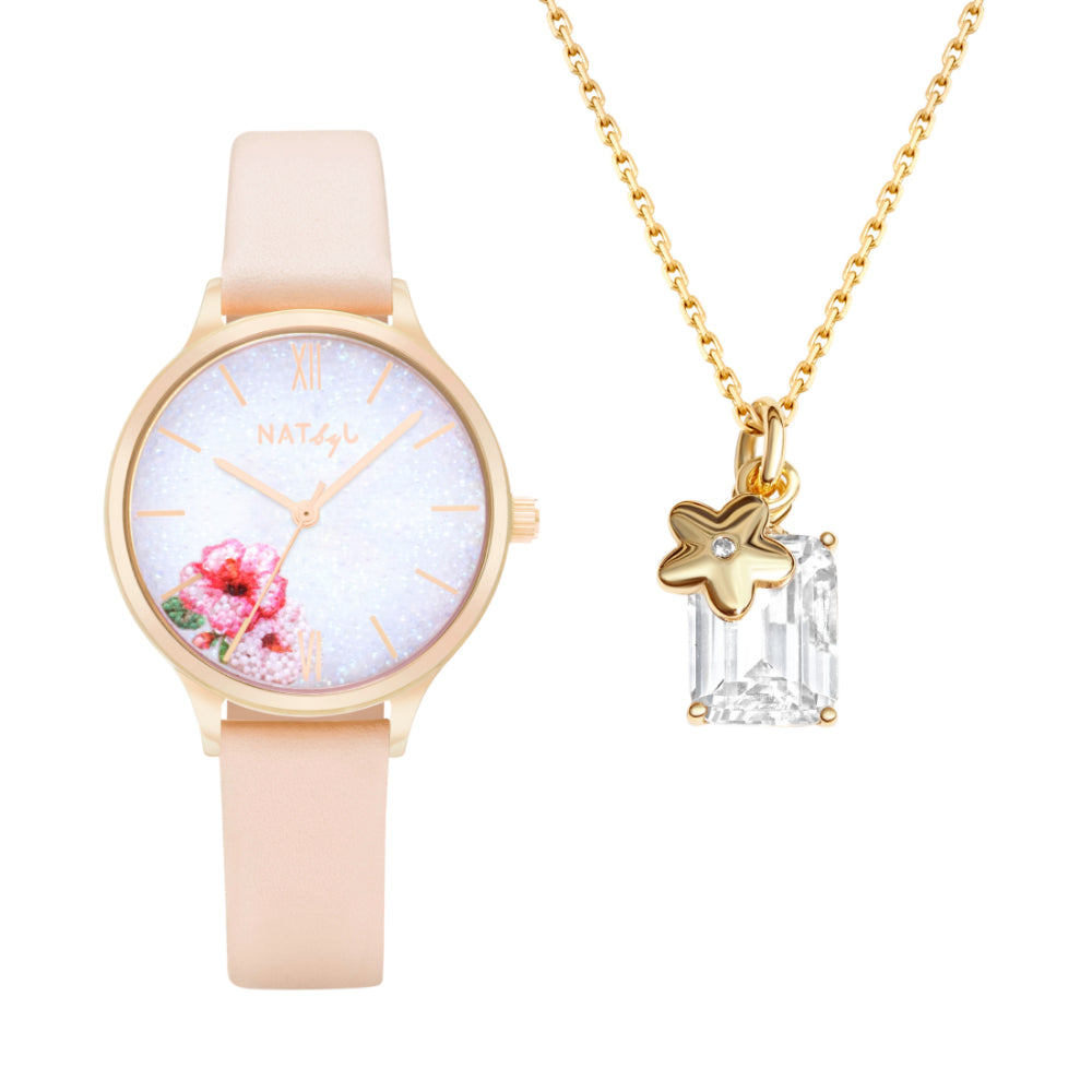 Inspired by the confidence in every woman, the NATbyJ Dazzle collection showcases beautiful sparkling pieces that glamourize and dazzle any outfit. The dial features sparkling crystal dust with a beautiful pink hibiscus flower, paired with a light pink genuine leather strap and a rose gold-plated case.