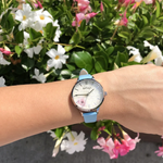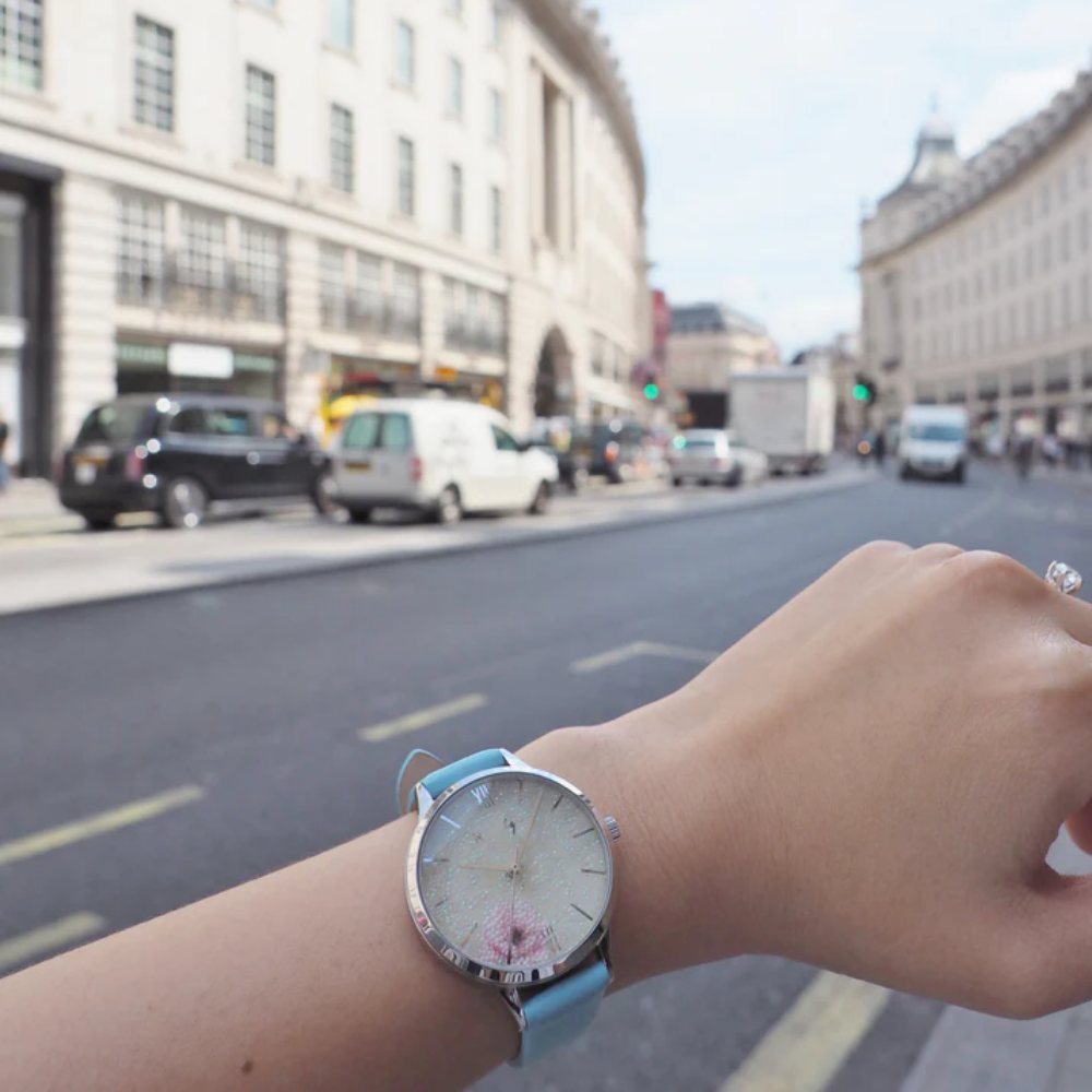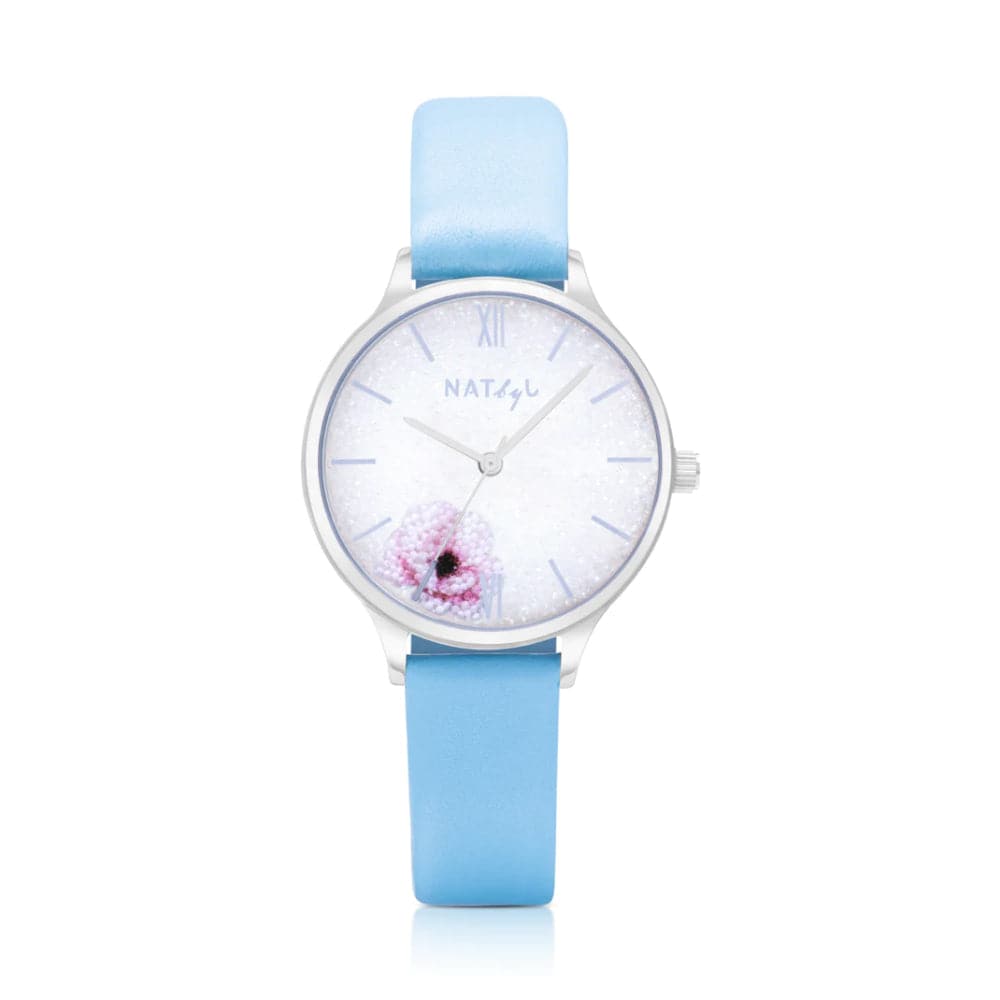 Inspired by the confidence in every woman, the NATbyJ Dazzle collection showcases beautiful sparkling pieces that glamourize and dazzle any outfit. The dial features sparkling crystal dust adorned with a beautiful pink cherry blossom, paired with a light blue genuine leather strap and a stainless steel case.