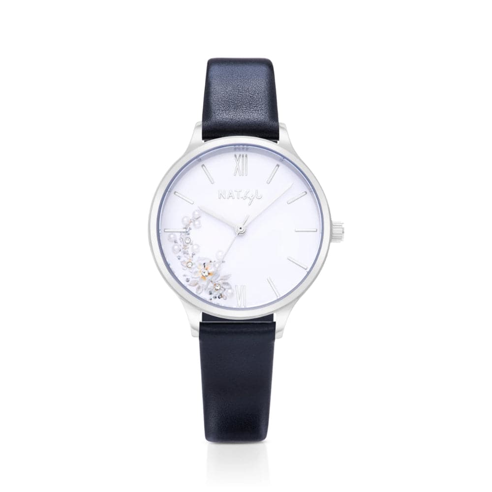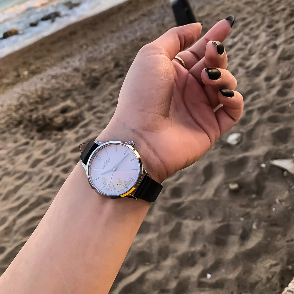 The dial features tiny pearls on the daisy flower bouquet design, paired with a black genuine leather strap and a stainless steel case.