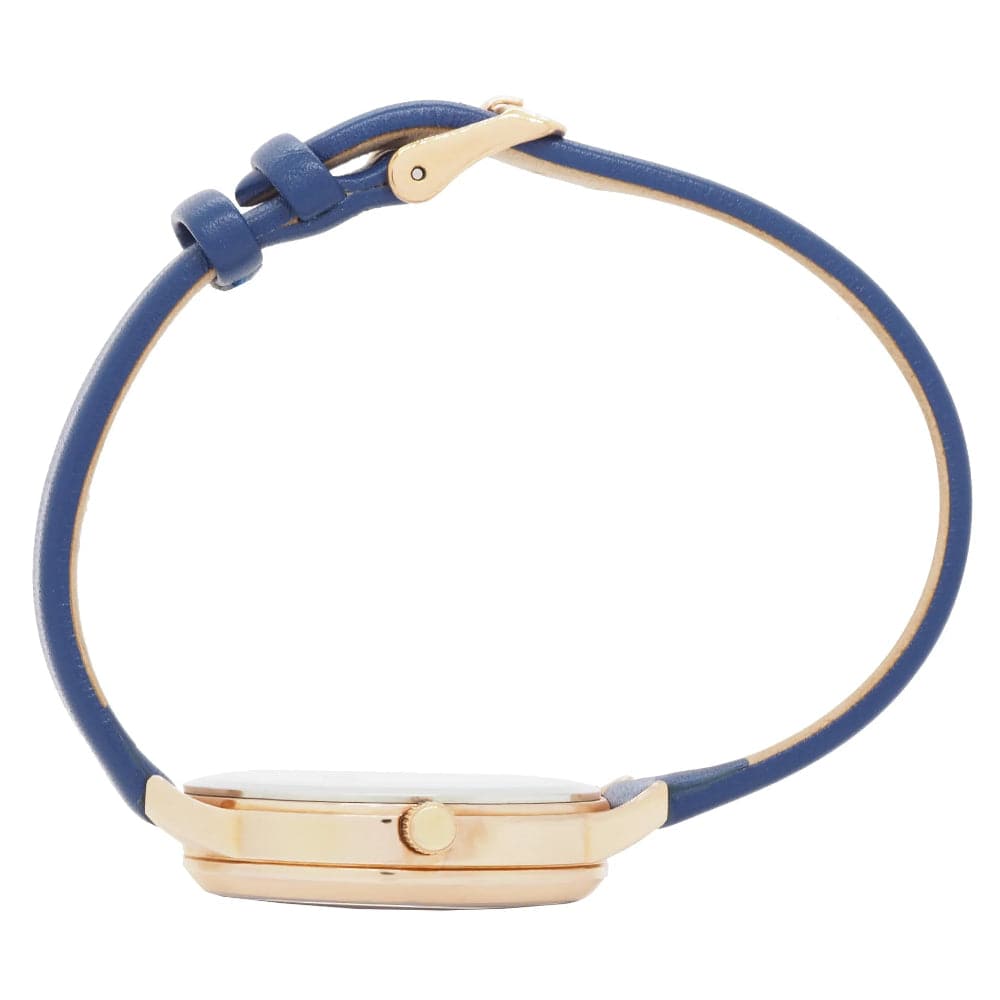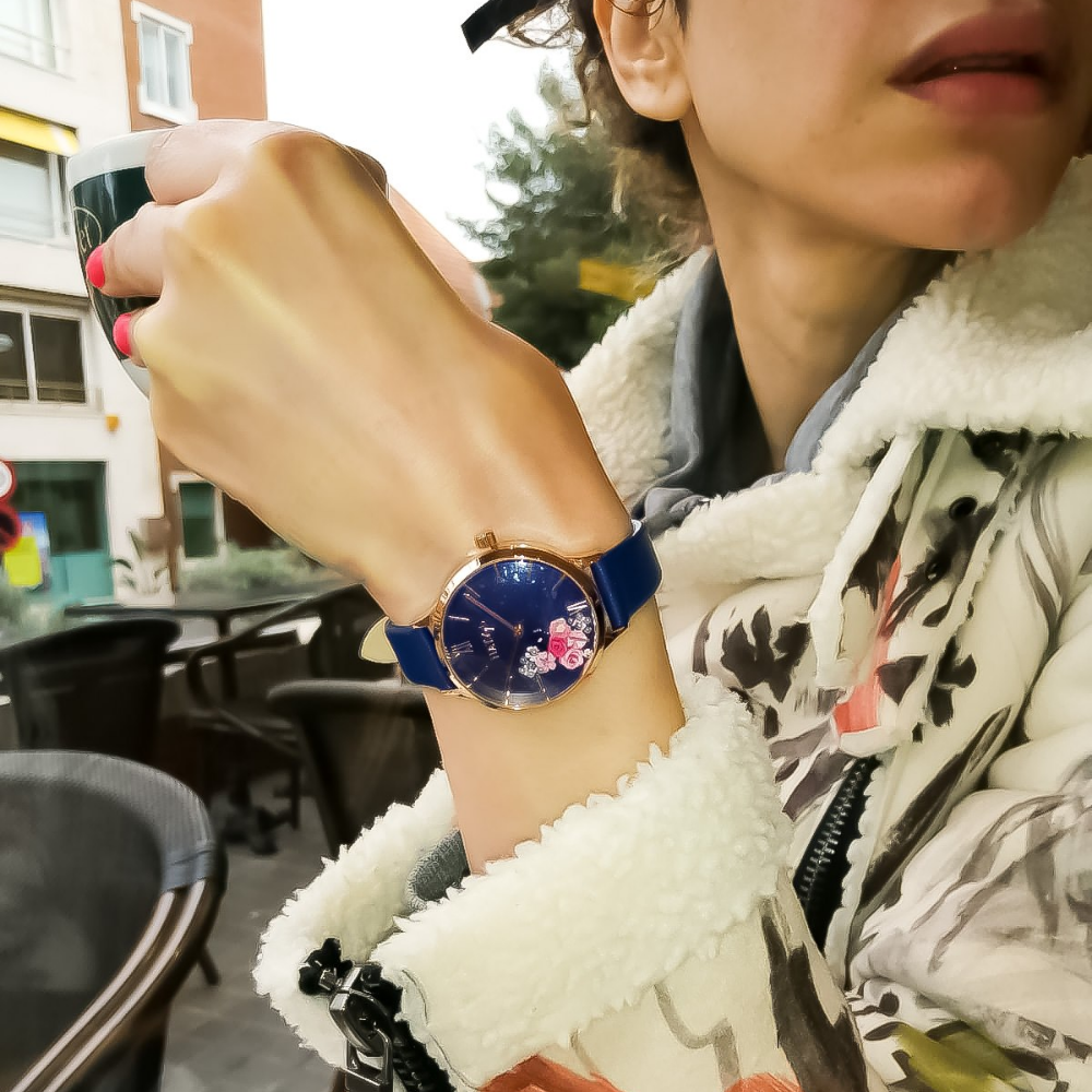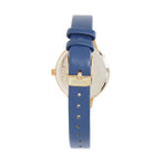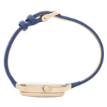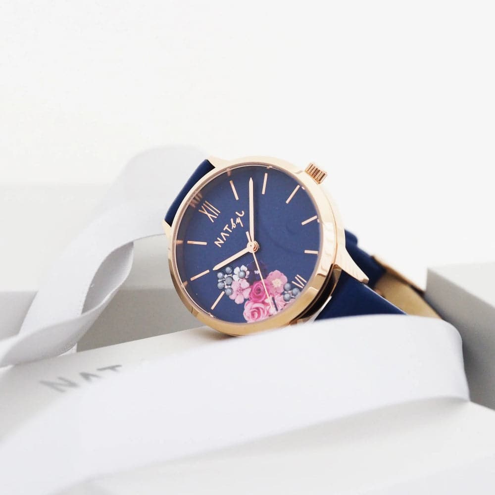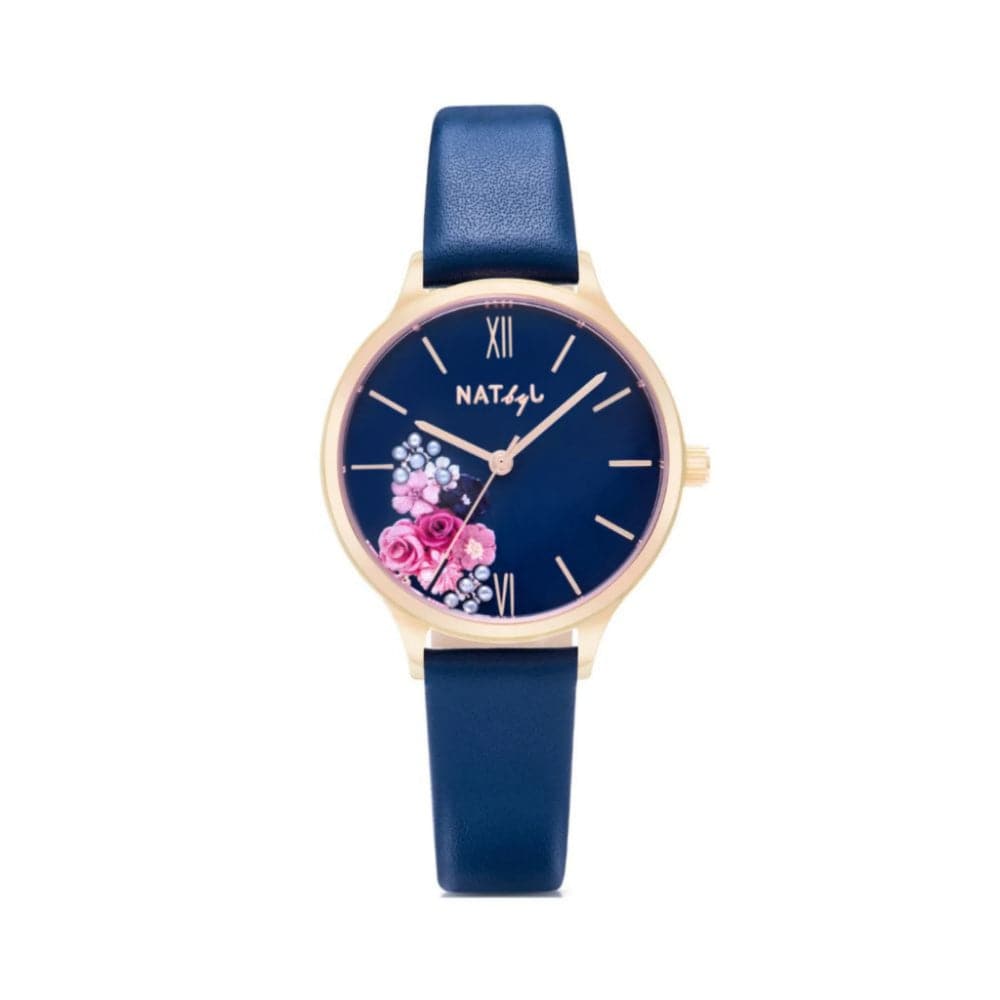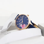 The dial features tiny pearls on the rose flower bouquet design, paired with a deep blue genuine leather strap and a rose gold-plated case.