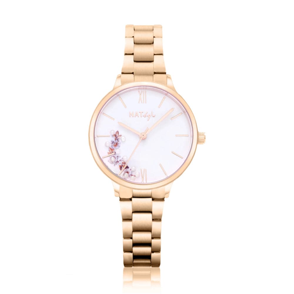 The dial features tiny pearls on the dainty Stephanotis flower bouquet design, paired with a rose gold-plated link bracelet and case.