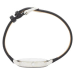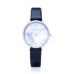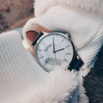 The timepiece features a classic white and black marble-effect dial and a light flowing feather motif, paired with a black genuine leather strap and a stainless steel case.