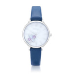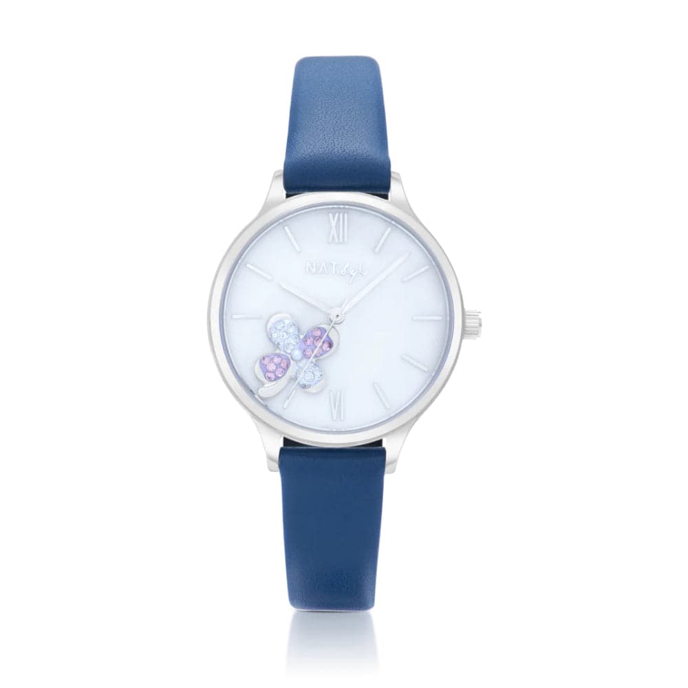 Our Serendipity collection represents the aptitude for making desirable discoveries by accident. The NATbyJ Serendipity 0502 timepiece features a good luck four-leaf clover charm adorned with colorful crystals on a white mother-of-pearl dial, paired with a deep blue genuine leather strap and a stainless steel case.
