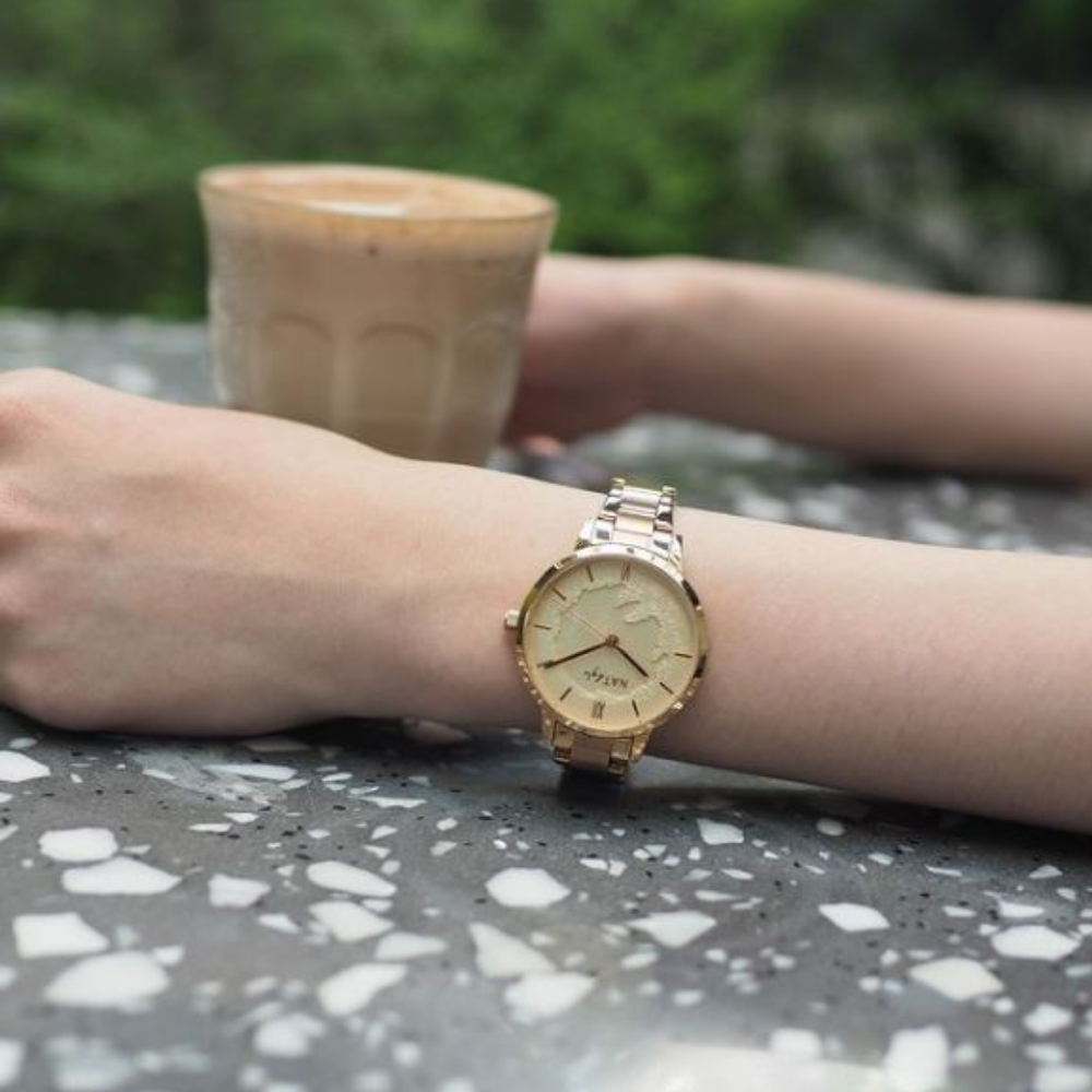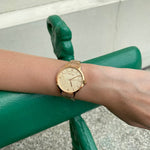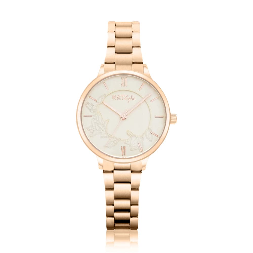The timepiece features a beautifully carved floral design on the two-layer beige dial, paired a rose gold-plated link bracelet and case.