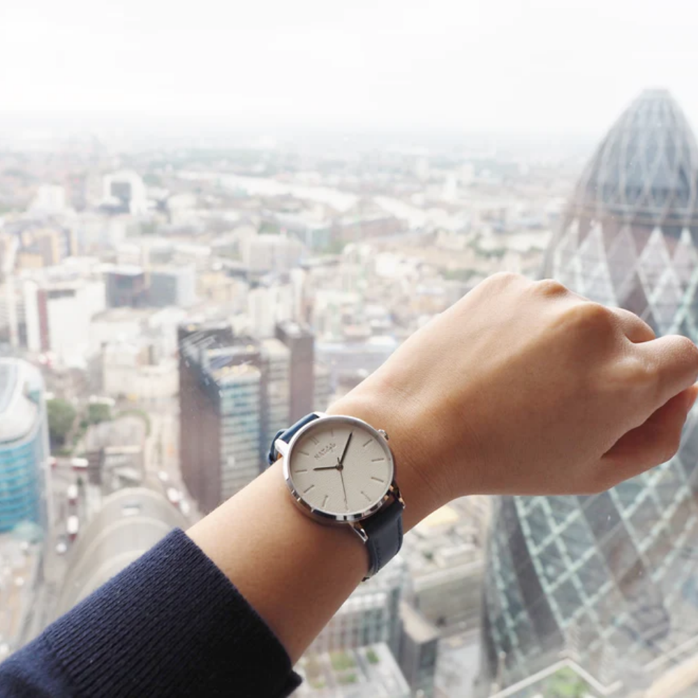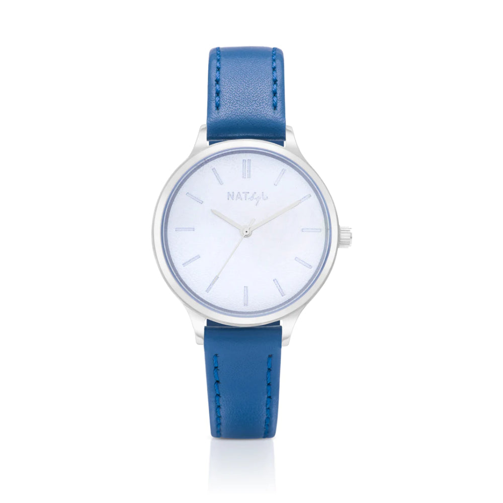 Our NATbyJ Unpretentious collection is for a modern woman who loves a versatile yet minimalist timepiece for daily wear. This NATbyJ Unpretentious 0102 timepiece features an embossed hour marker on a white leather dial, complemented with detailed stitching on the blue genuine leather strap and a stainless steel case.