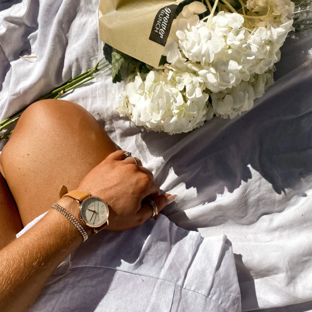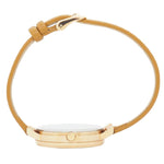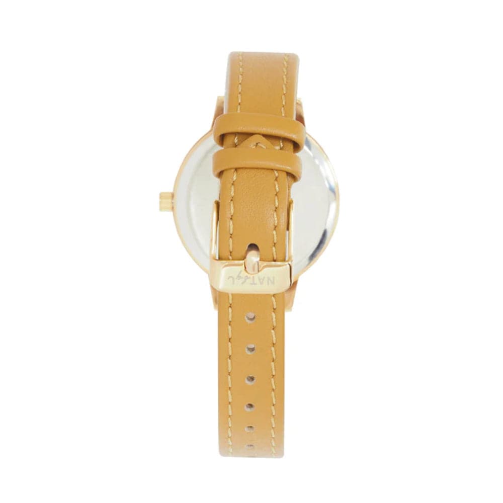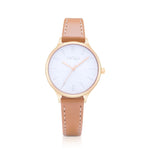 Our NATbyJ Unpretentious collection is for a modern woman who loves a versatile yet minimalist timepiece for daily wear. This NATbyJ Unpretentious 0109 timepiece features an embossed hour marker on a white leather dial, complemented with detailed stitching on the light brown genuine leather strap and a rose gold-plated stainless steel case.