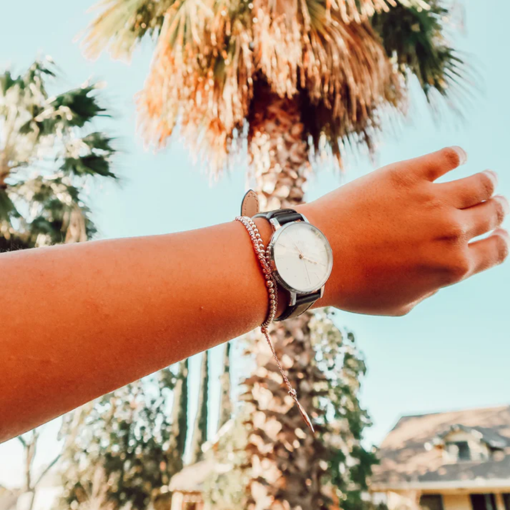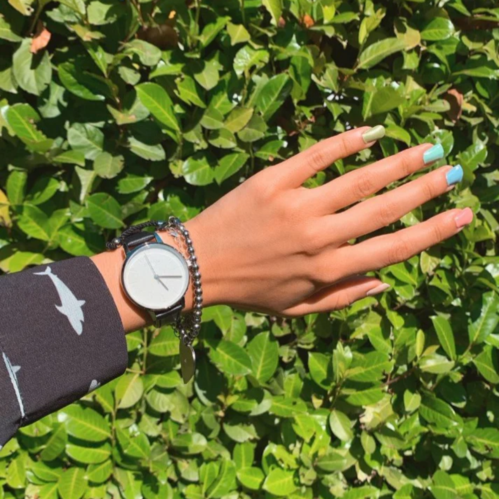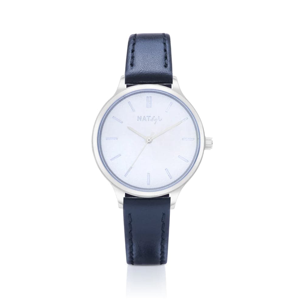 Our NATbyJ Unpretentious collection is for a modern woman who loves a versatile yet minimalist timepiece for daily wear. This NATbyJ Unpretentious 0101 timepiece features an embossed hour marker on a white leather dial, complemented with detailed stitching on the black genuine leather strap and a stainless steel case.