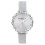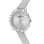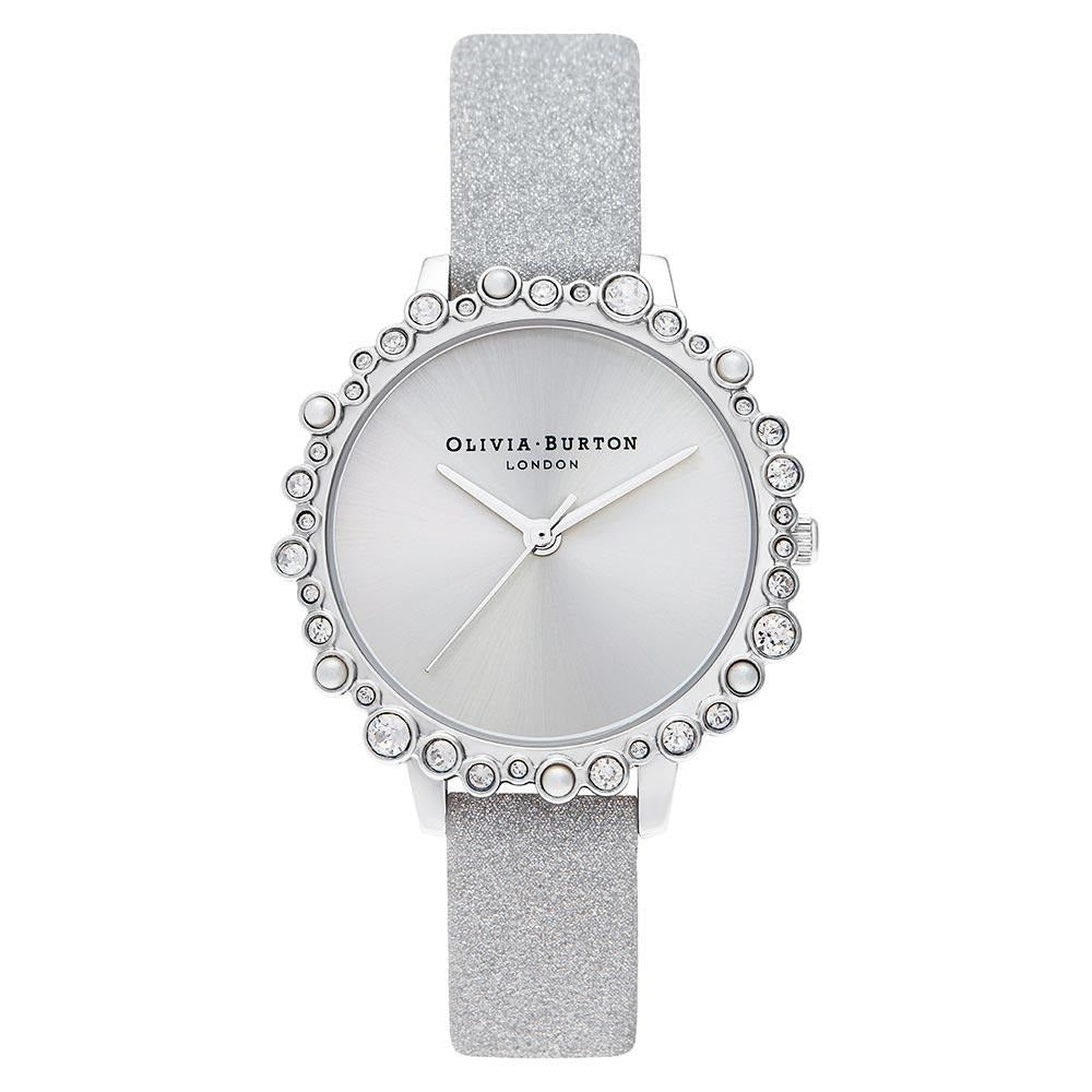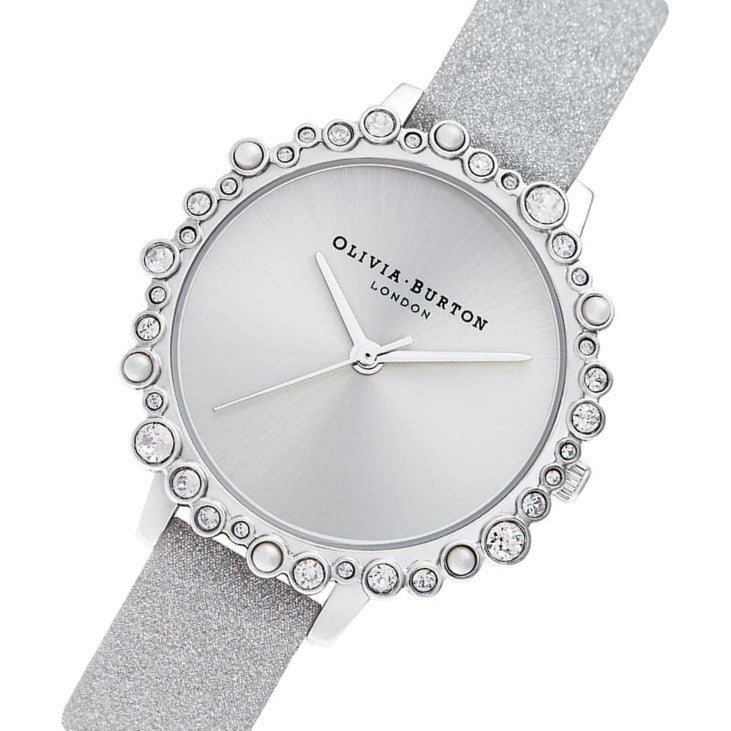 This Olivia Burton watch is a stunning addition to your collection, featuring a sleek gray dial with a silver sunray finish and a sparkling silver glitter leather strap. The bubble case design offers a unique, eye-catching look, perfect for adding a touch of glamour to any outfit.