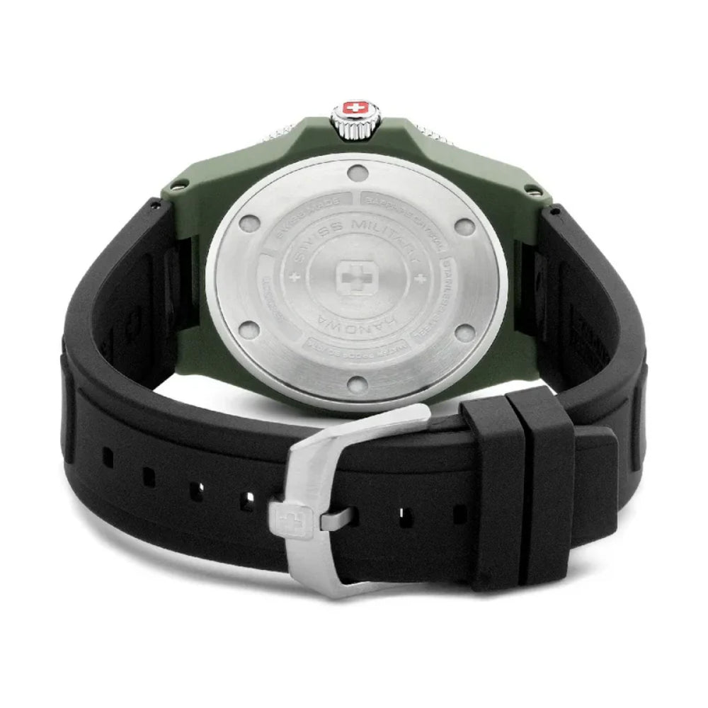 The Swiss Military Hanowa Ocean Pioneer #Tide SMWGN0001181 is a phenomenal Swiss Made watch with a quartz movement. The case is made from #tide ocean-bound plastic, which shows the brand's commitment to operating in a more sustainable and ethical fashion. This material is lightweight and sturdy, which makes the watch even more comfortable, especially with the supple silicone strap. Another benefit is that this material is coloured entirely and not just coated. At 45mm (excluding crown) and 11mm thickness this watch has substantial wrist presence which goes very well with the casual style of the watch.