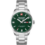 This Swiss Military Hanowa watch has a case made of stainless steel with a diameter of 43 mm and is fitted with a metal band. Inside the case lies a Ronda movement and the watch features a Sapphire crystal.