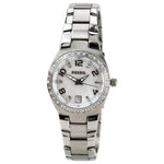 Stainless steel case with a stainless steel link bracelet. Fixed stainless steel bezel set with crystals. Mother of pearl dial with luminous hands and alternating Arabic numeral and crystal filled index hour markers. Minute markers around the outer rim. Date display appears at the 6 o'clock position. Quartz movement. Scratch resistant mineral crystal. Push / pull crown. Solid case back. Case diameter: 28 mm. Case thickness: 9 mm. Fold over clasp. Water resistant at 100 meters/ 330 feet. Functions: hours, minutes, seconds, calendar.