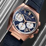 Frederique Constant’s showcase collection is celebrating its twenty-fifth anniversary this year and unveiling brand new variations of its sports model, the 41-millimetre Chronograph Automatic, to mark the occasion. The non-limited edition featuring the exquisitely elegant combination of a rose gold-plated case and a midnight blue dial. Powered by the FC-391 calibre with its 60-hour power reserve, the piece will comes with two interchangeable straps, as is the custom.