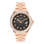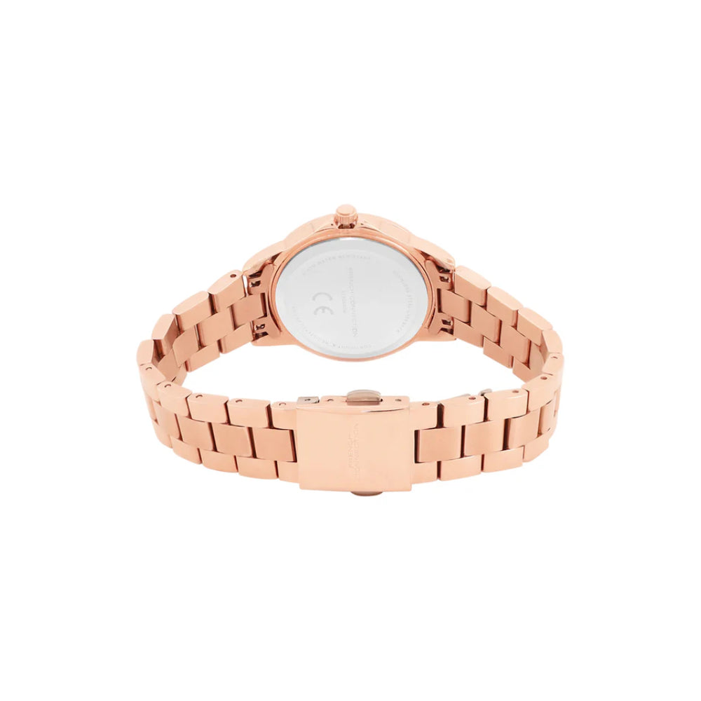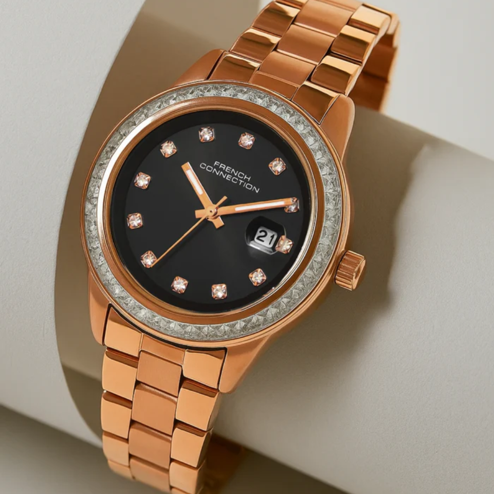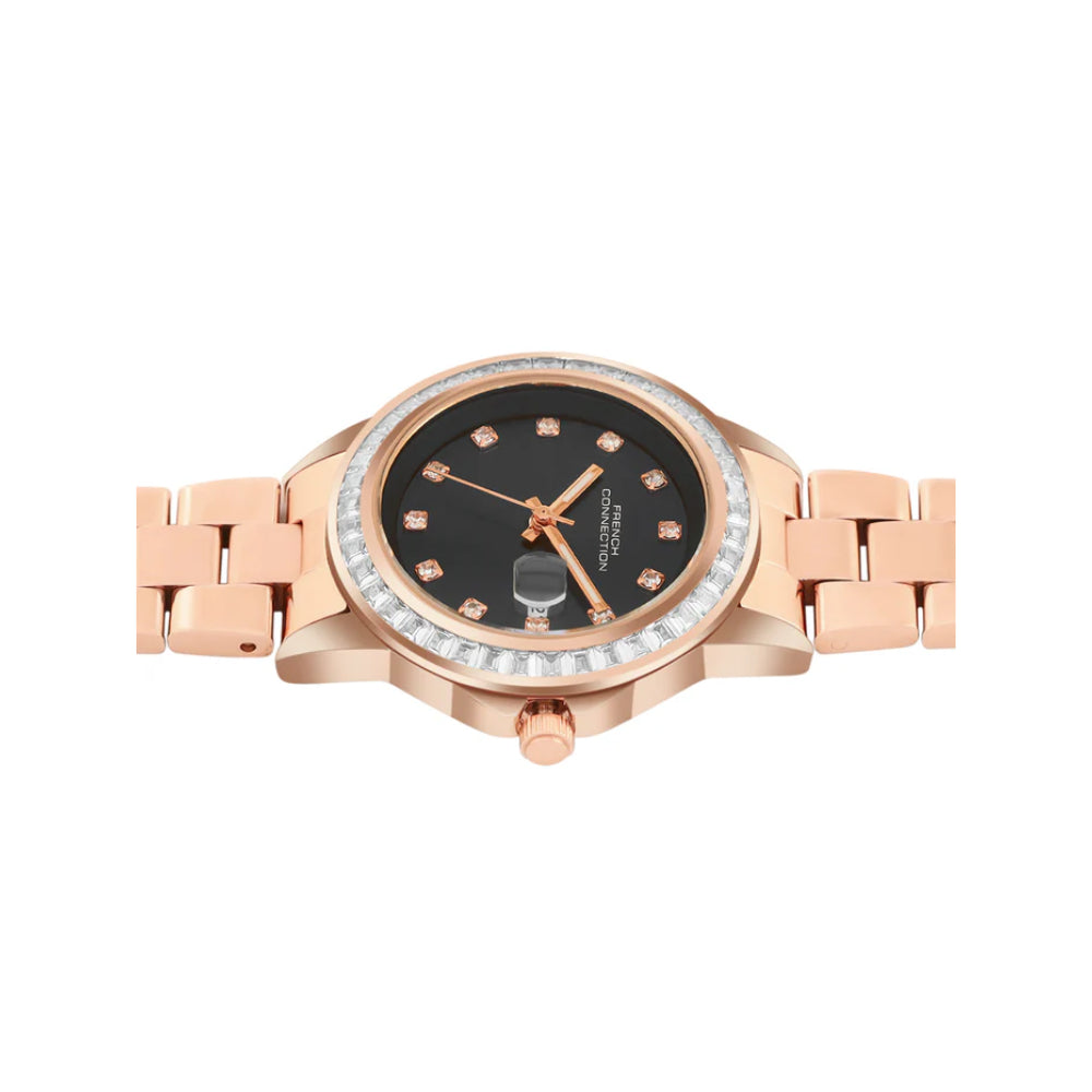 Command sophistication with the French Connection Black Dial Stainless Steel Strap Women's Watch. This elegant timepiece features a classic black dial complemented by a rose gold-tone stainless steel case and matching bracelet strap, creating a striking contrast. The warm metallic finish adds luxury and refinement while the dark dial ensures excellent readability. The polished stainless steel construction guarantees lasting quality and shine. Perfect for the woman who appreciates timeless elegance and the interplay of contrasting finishes. This watch transitions seamlessly from professional environments to evening events, making it an essential accessory for any collection. Model FCH26RGM.