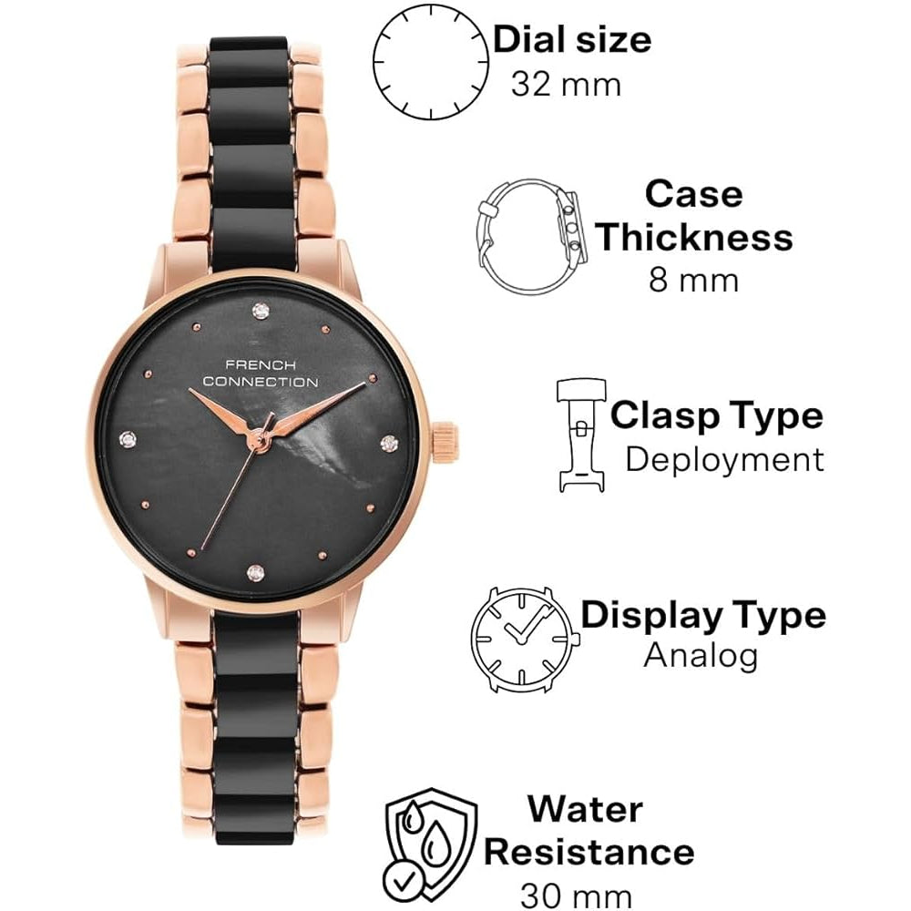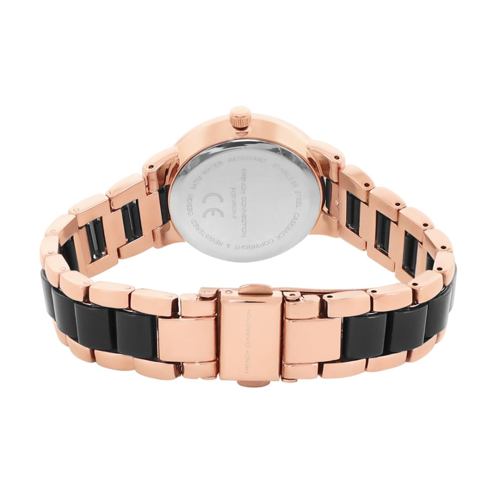 Exude timeless elegance with the French Connection Black Stainless Steel Strap Women's Watch. This sophisticated timepiece features a sleek black dial paired with a rose gold-tone stainless steel case and matching bracelet strap, creating a striking contrast of modern and classic elements. The polished metal finish adds warmth and refinement to the bold dial. Built with quality materials for lasting durability, this watch transitions seamlessly from day to evening. An essential accessory for the woman who values understated luxury and versatile style. Model FCB10RGM-B.