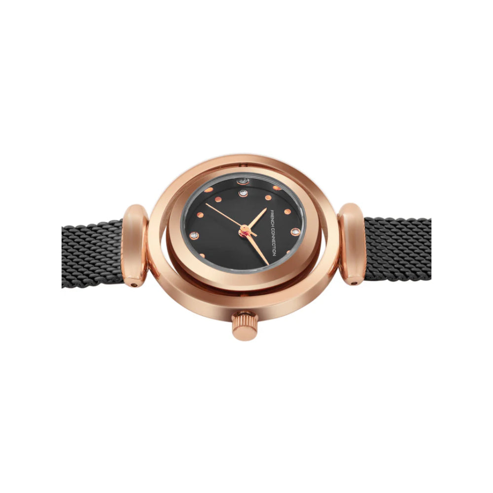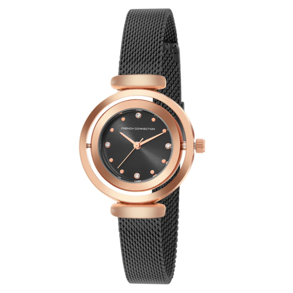 Command presence with the French Connection Black Stainless Steel Strap Women's Watch. This sleek timepiece features a black stainless steel case paired with a matching bracelet strap, creating a bold and refined aesthetic. The polished metal finish delivers contemporary elegance that complements any style effortlessly. The clean dial design ensures perfect readability while maintaining understated beauty. Engineered with quality materials for exceptional durability and enduring shine. Perfect for the woman who appreciates modern sophistication and the timeless appeal of black finishes. This watch transitions seamlessly from professional environments to casual occasions, making it an essential accessory. Model FCMX1BM.