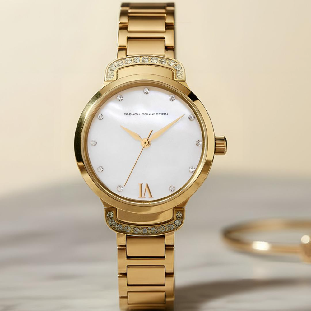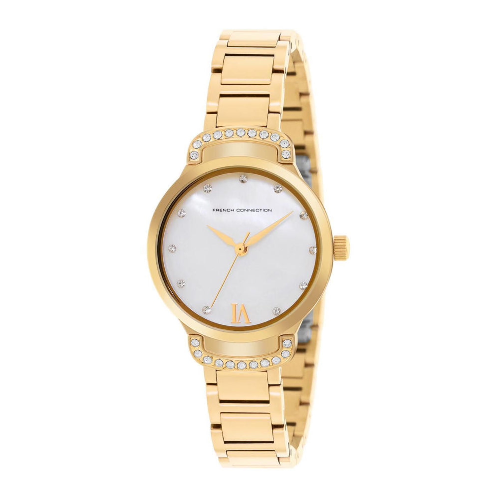 Elevate your everyday style with the French Connection Gold Stainless Steel Strap Women's Watch FCH7GM. This sophisticated timepiece features a gleaming gold-tone stainless steel case and matching bracelet strap, delivering timeless elegance on your wrist. Powered by reliable quartz movement, this 33mm watch combines functionality with refined aesthetics. The mineral glass face protects your view while the 3-hand display with chronograph function keeps you on schedule. Water-resistant to 30m, it handles daily wear with ease—perfect for work, casual outings, or special occasions. Backed by a 1-year warranty, this French Connection watch is a versatile accessory that transitions seamlessly from day to night. Discover understated luxury that complements any wardrobe.