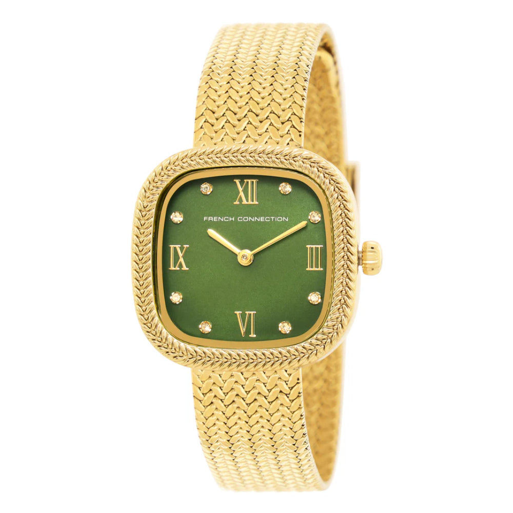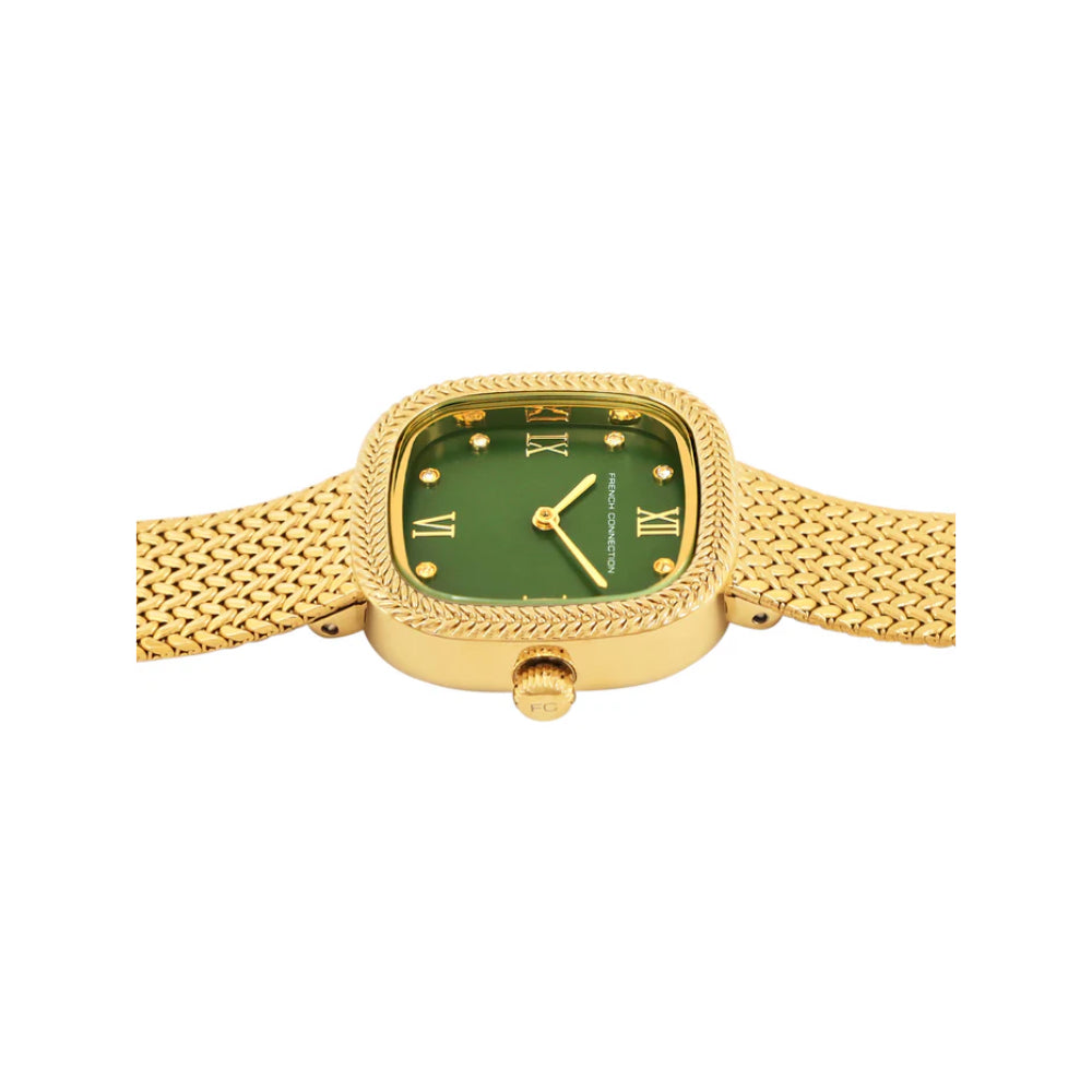 Make an impression with the French Connection Green Dial Stainless Steel Mesh Strap Women's Watch. The striking green dial commands attention, beautifully framed by a polished stainless steel case and innovative mesh strap. The flexible mesh design hugs your wrist comfortably while maintaining a sophisticated appearance. Perfect for those who seek contemporary style without sacrificing comfort. The durable construction resists wear while keeping its elegant finish intact. A modern accessory that celebrates bold colour and refined craftsmanship. Model: FCO2NGM.
