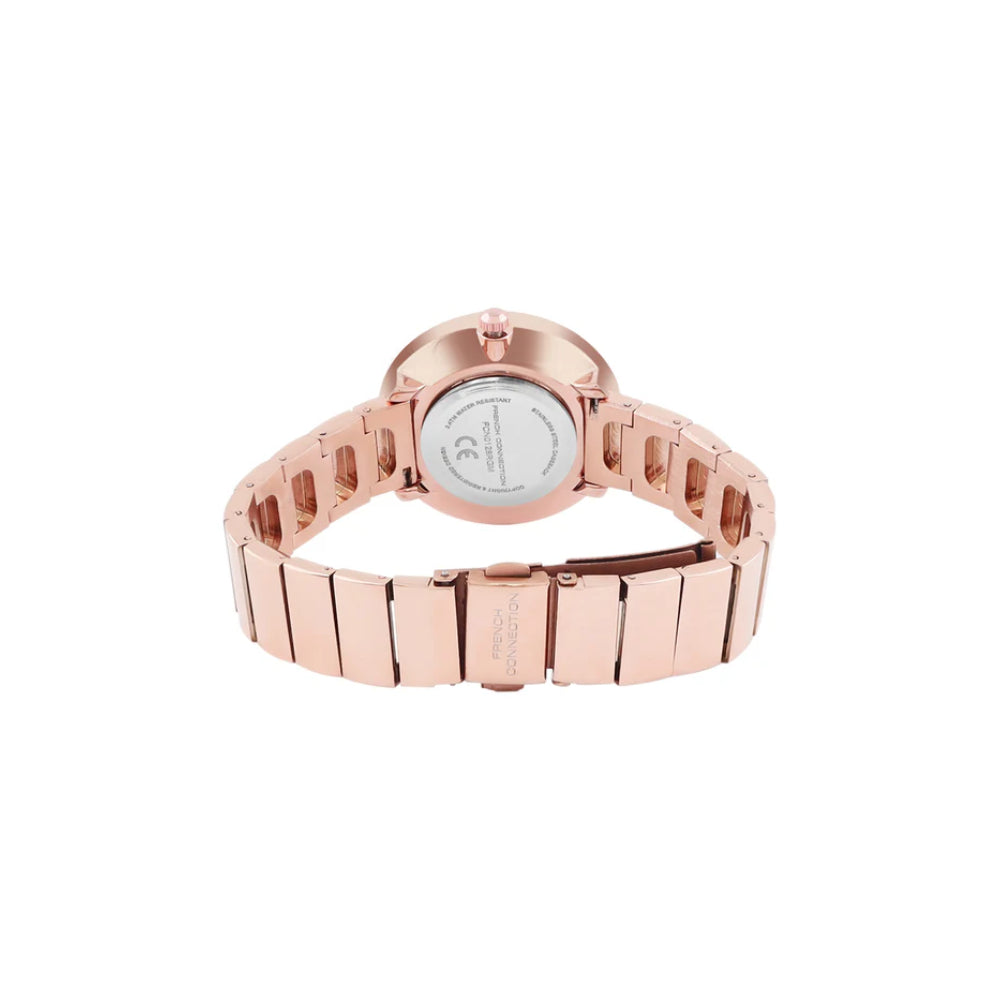 Celebrate elegance with the French Connection Rose Gold Stainless Steel Strap Women's Watch. The sophisticated rose gold case and polished stainless steel strap create a harmonious blend of warmth and shine. This refined timepiece effortlessly transitions from professional settings to evening events, offering versatility with understated luxury. The premium construction resists tarnishing and maintains its lustrous finish through daily wear. A timeless investment that enhances your personal style with grace and sophistication. Model: FCN0128RGM.