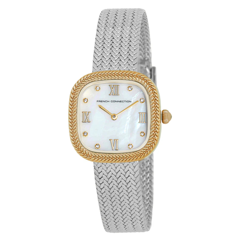 Shine with the French Connection Silver Stainless Steel Mesh Strap Women's Watch. The pristine silver dial gleams against the polished stainless steel case and innovative mesh strap, creating a luminous and refined aesthetic. The flexible mesh design provides all-day comfort while maintaining an elegant silhouette. This versatile timepiece complements any wardrobe, from professional attire to weekend wear. The durable construction resists scratches and maintains its brilliant finish. A timeless accessory that brings understated luxury to your everyday style. Model: FCO2SM.