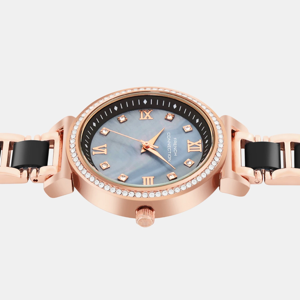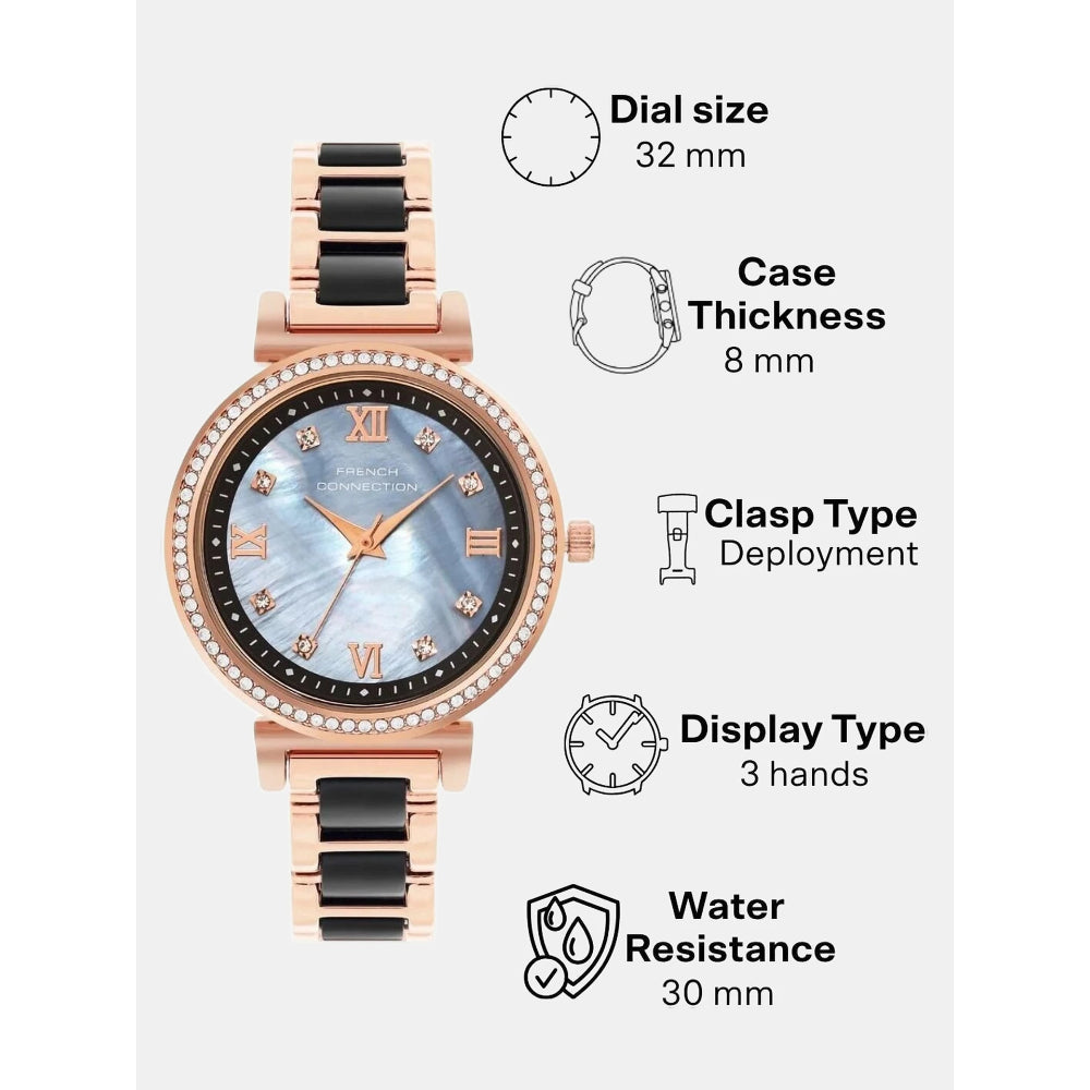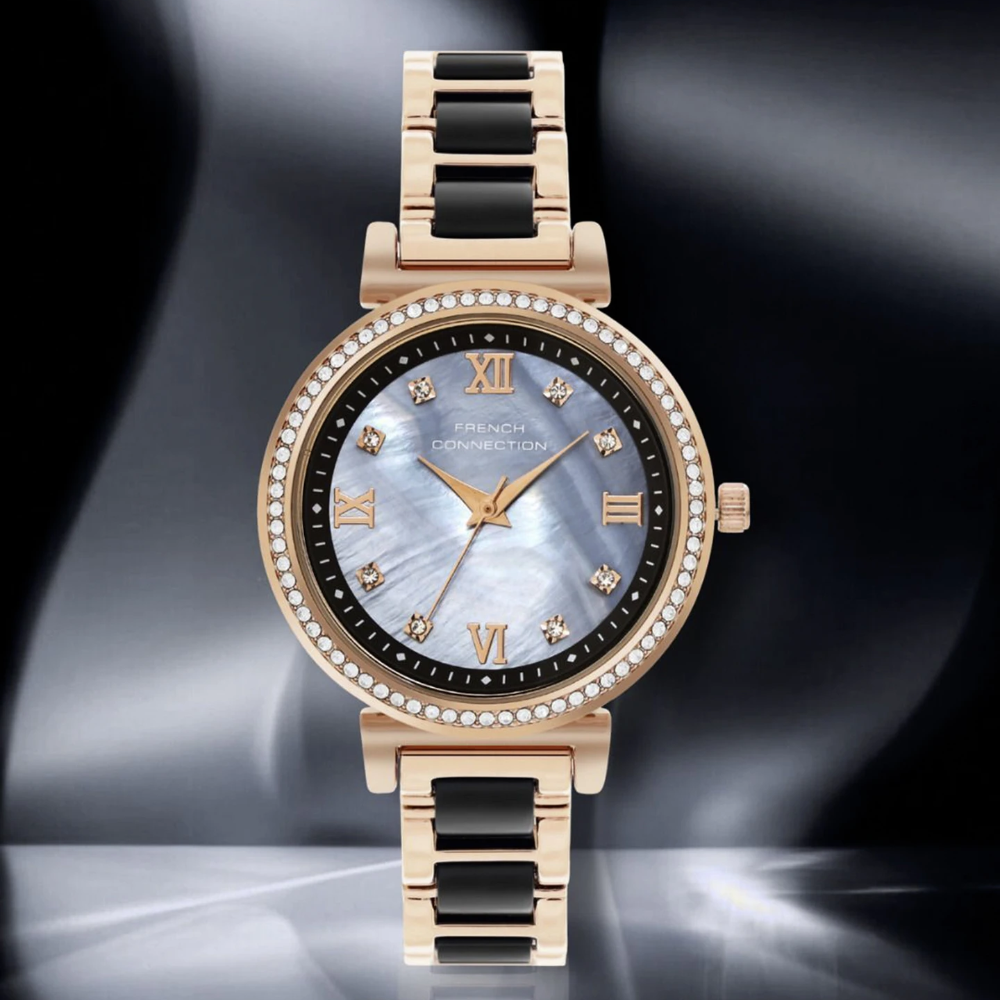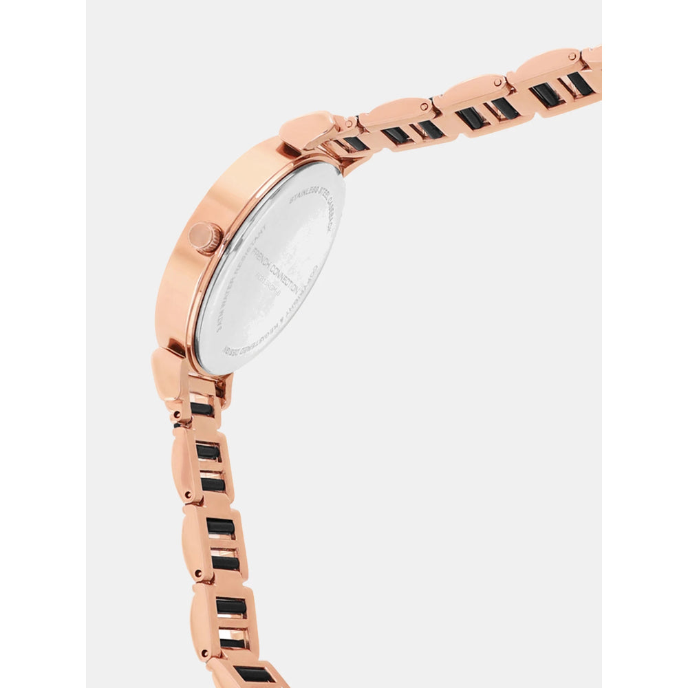 Embrace refined versatility with the French Connection Two-Tone Stainless Steel Strap Women's Watch. This elegant timepiece combines contrasting metal finishes in a harmonious design that adapts to any occasion. The two-tone case and matching bracelet strap create a sophisticated look that works seamlessly across professional and social settings. The polished stainless steel construction ensures durability and lasting beauty. Perfect for the woman who values timeless elegance and appreciates the balance between classic and contemporary design. A versatile essential that complements any wardrobe with understated luxury. Model FCB13RGM-B.