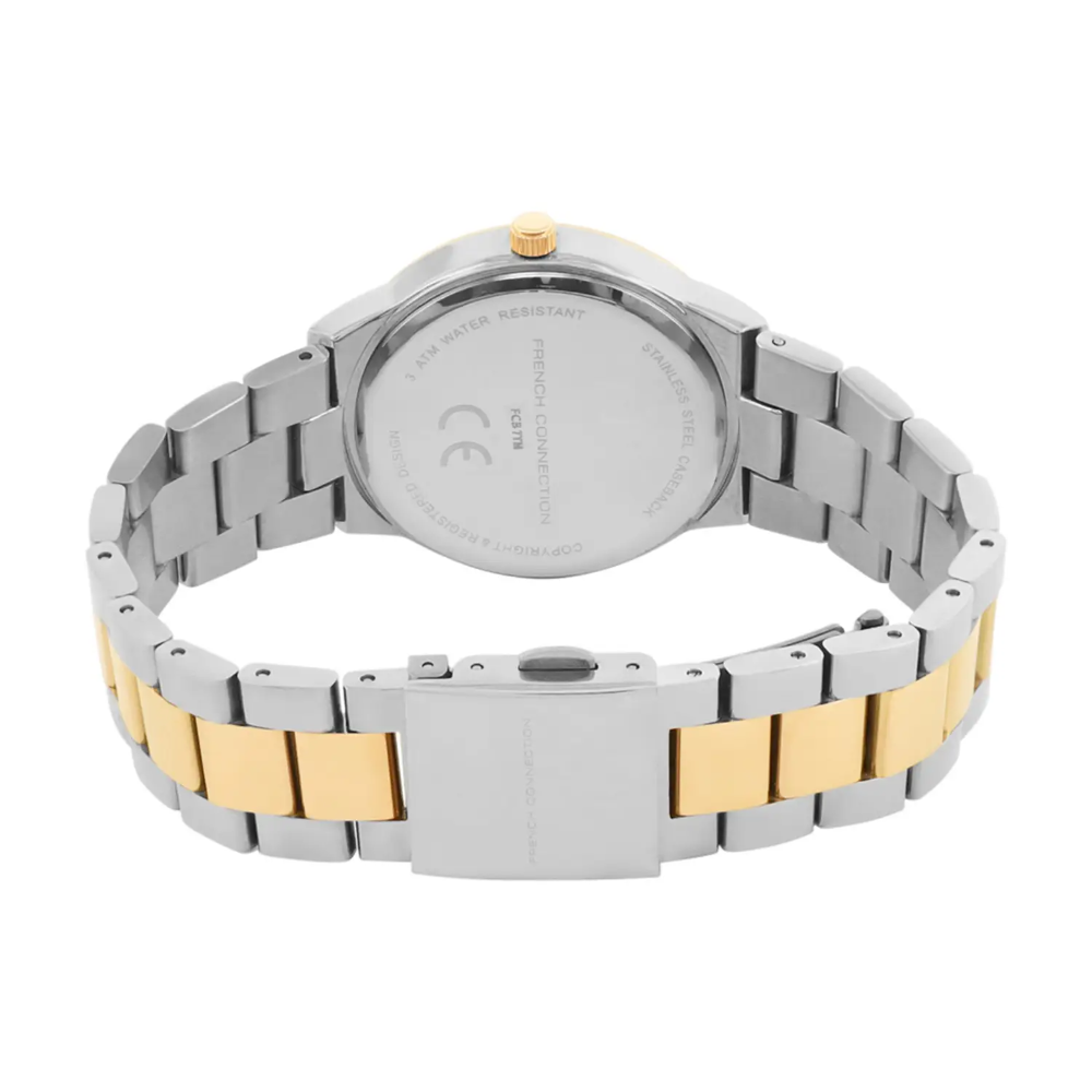 Celebrate refined elegance with the French Connection Two-Tone Stainless Steel Strap Women's Watch. This sophisticated timepiece harmonizes contrasting metal finishes in a versatile design that transitions seamlessly across any setting. The two-tone case and coordinating bracelet strap deliver polished sophistication suitable for boardroom meetings and evening occasions alike. The durable stainless steel construction maintains its lustrous finish through daily wear. Ideal for the woman who values timeless design and appreciates the subtle interplay between classic and contemporary aesthetics. A wardrobe essential that brings understated luxury to every moment.