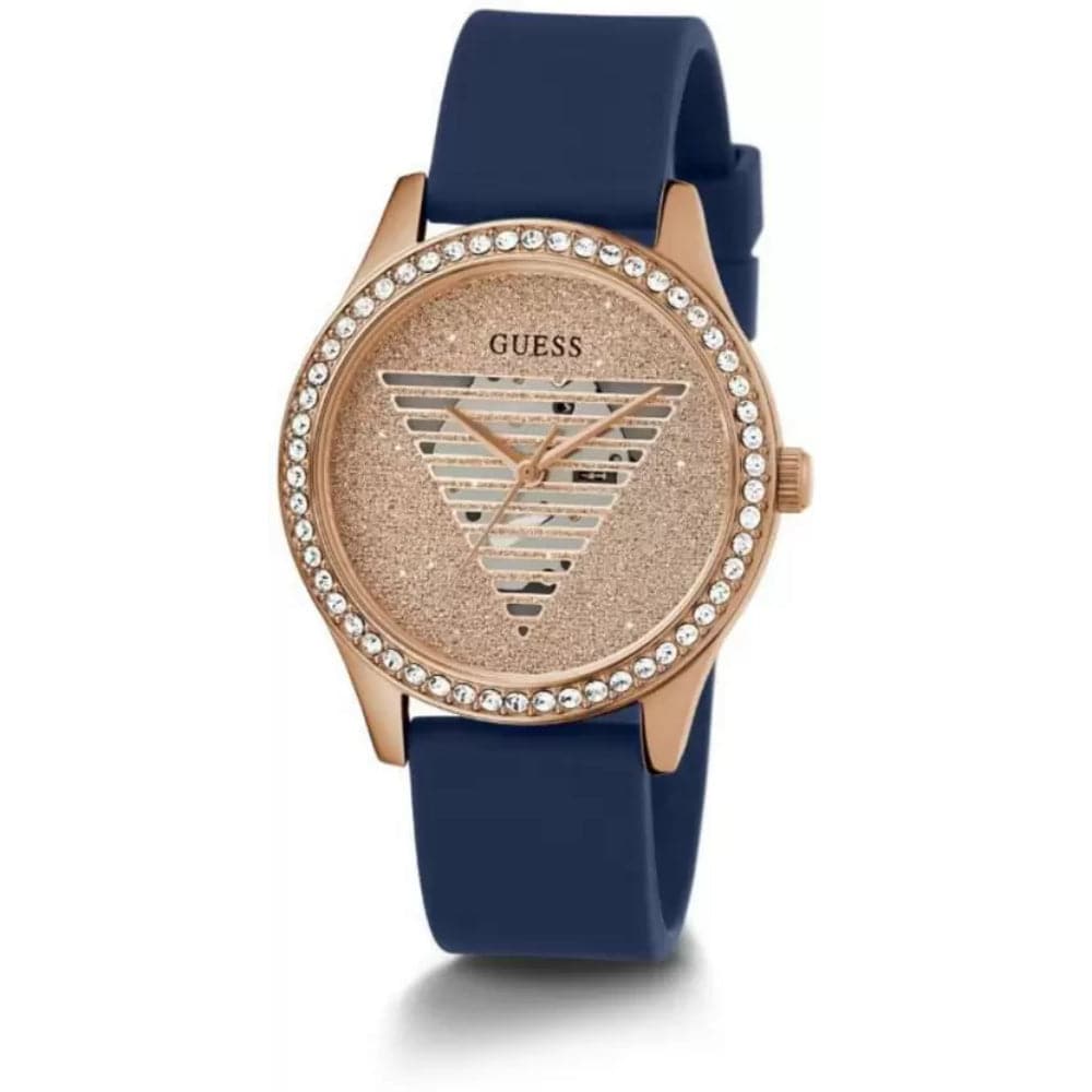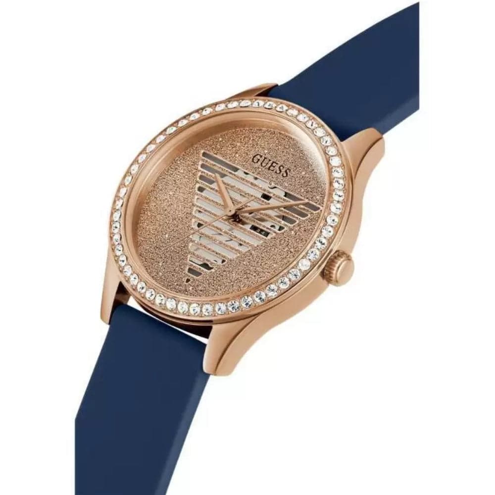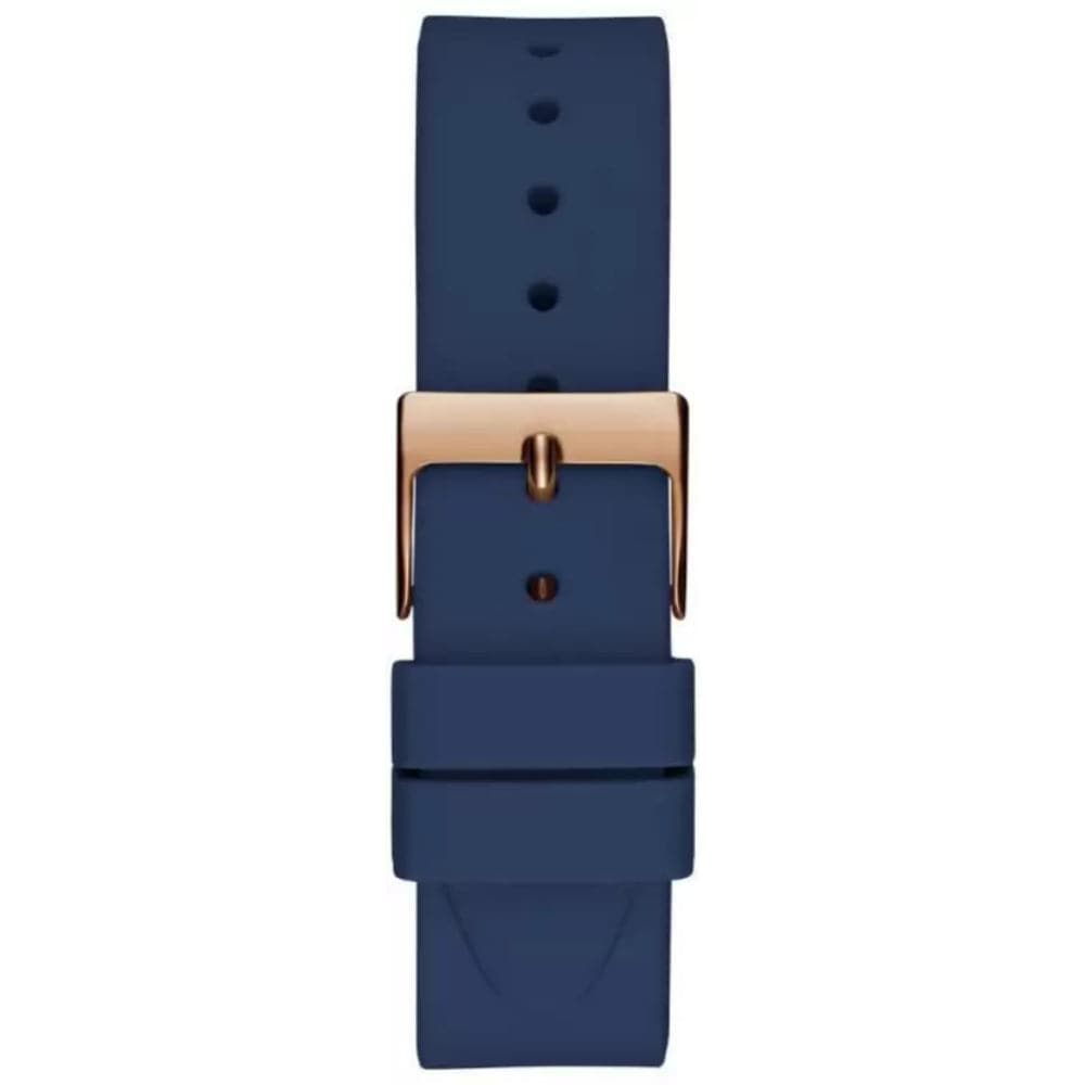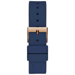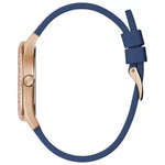 Carry great technology wrapped around your wrist with this stylish women's analog watch from the Lady Idol collection by GUESS. Functional on a quartz movement, the rose gold round dial is housed in a 30.8 mm case. It displays plain three hands and a crown for time adjustment. The silicon strap exudes a blue hue that accentuates the look of the watch. Moreover, it is fitted with a buckle clasp to ensure a secure fit on the wrist.