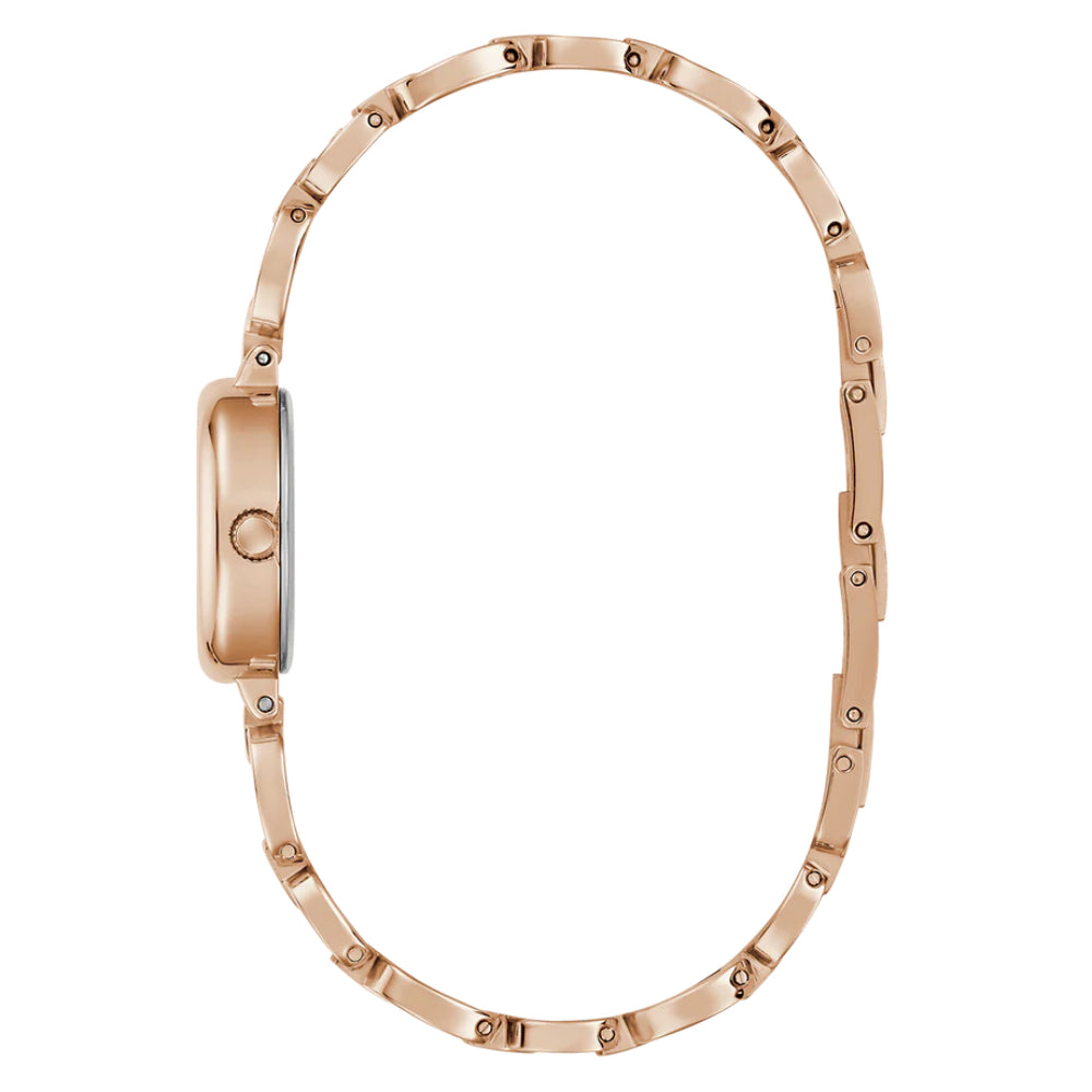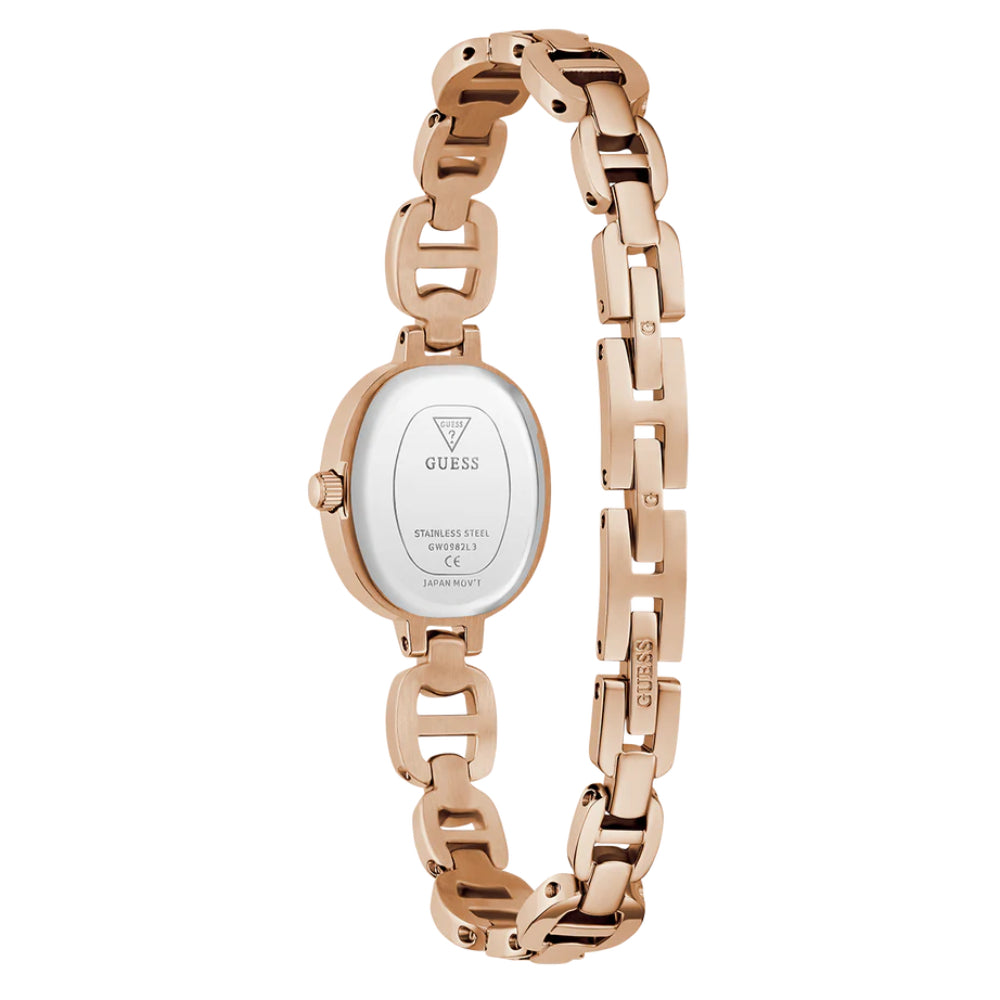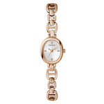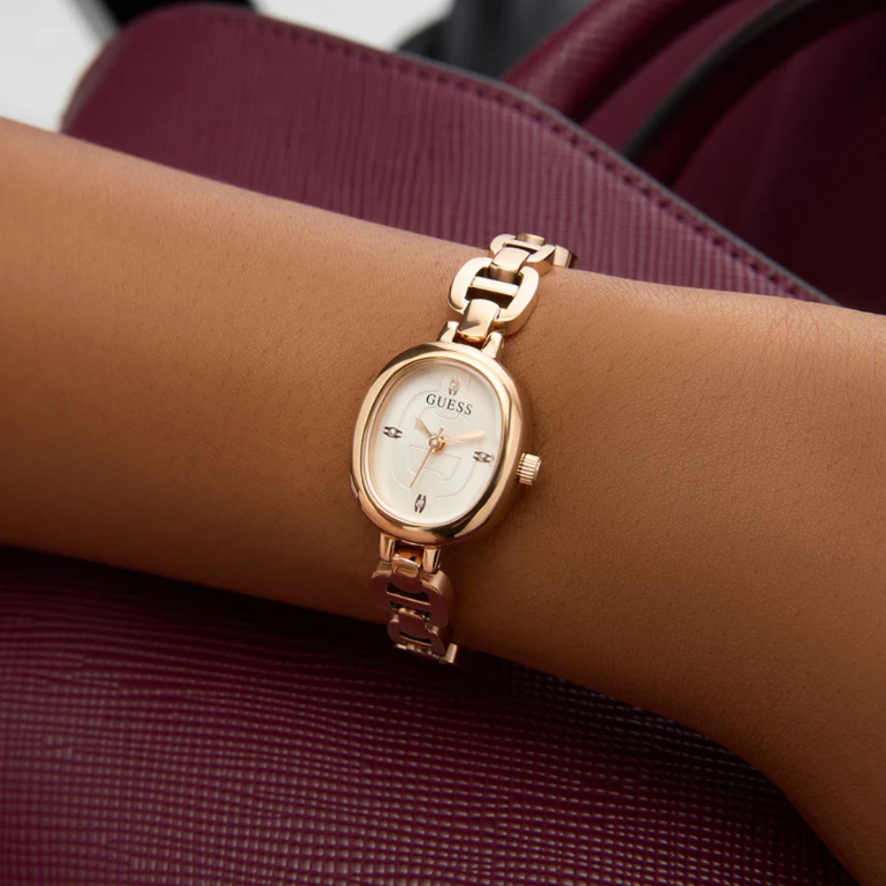 Feminine and fierce, this rose gold chain watch gives elegance an edge. The 24 x 21 mm oval case houses a sunray white dial with a chain detail that ties into the chain bracelet. Self-adjustable G-links make it incredibly easy to get the perfect fit, whether worn alone or stacked with other jewelry, this style is sure to be a staple in your watch wardrobe!