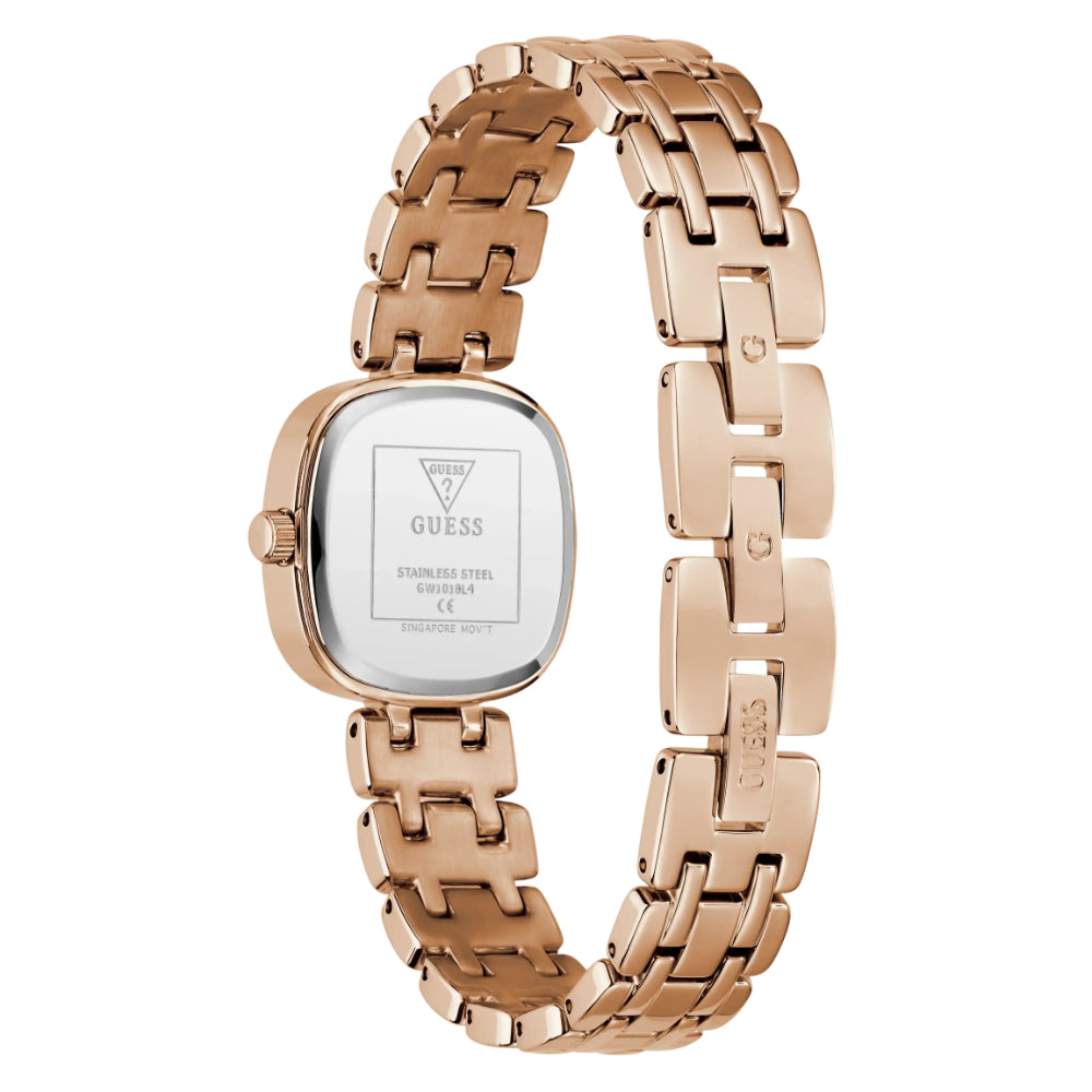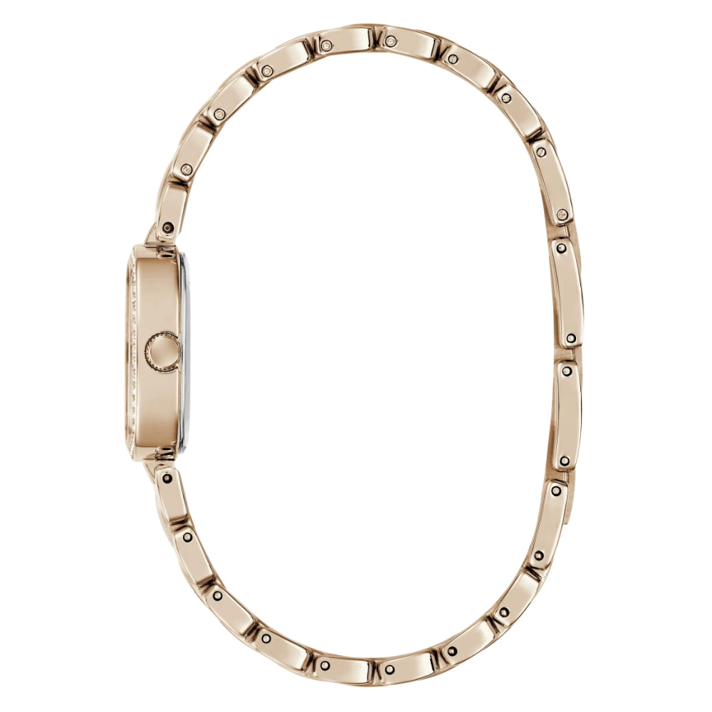 This Guess analog timepiece showcases rose gold stainless steel construction throughout its case and strap, creating a cohesive luxurious look. The refined dial presents a balanced aesthetic that transitions seamlessly from day to evening wear. Built with quality materials, this women's watch offers reliable performance and lasting durability.