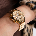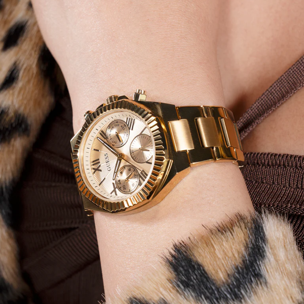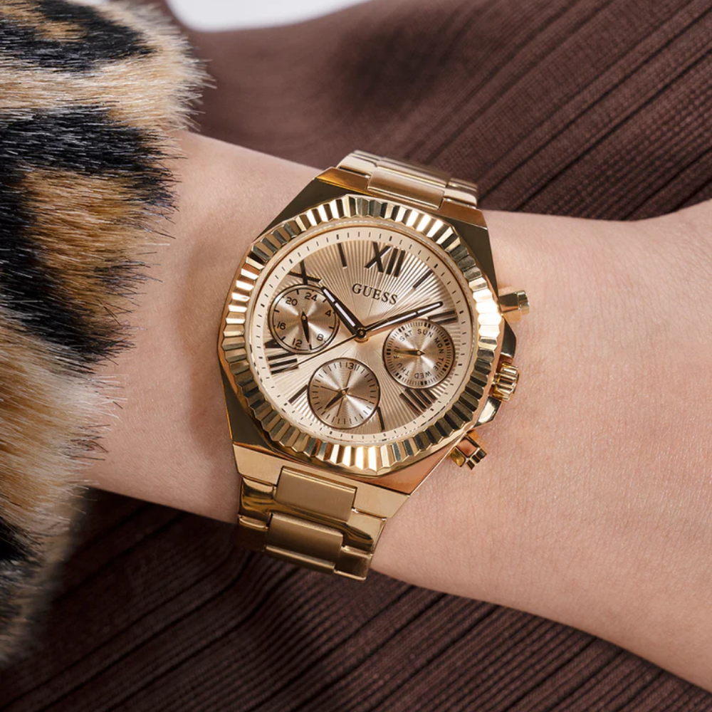 This new dress style features a coin edge bezel and chrono-look multi-function dial on a sleek 3 link bracelet with brushed and polished finishing.
