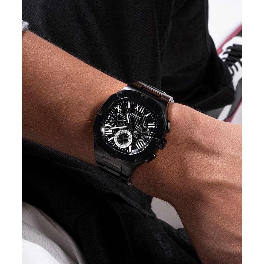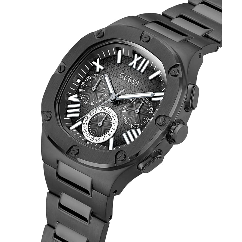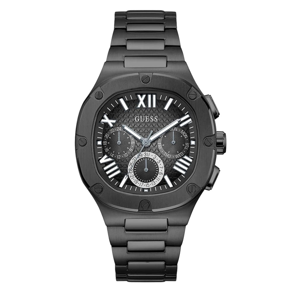 This headliner is sure to steal the show, it has a unique rounded square case design with screw details and a textured multi-function dial with ombre effect and a brushed and polished bracelet.