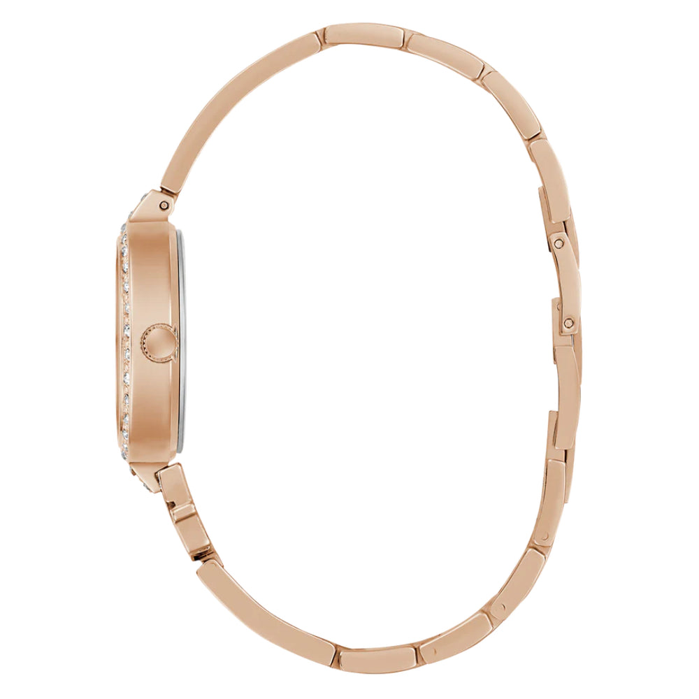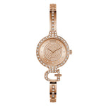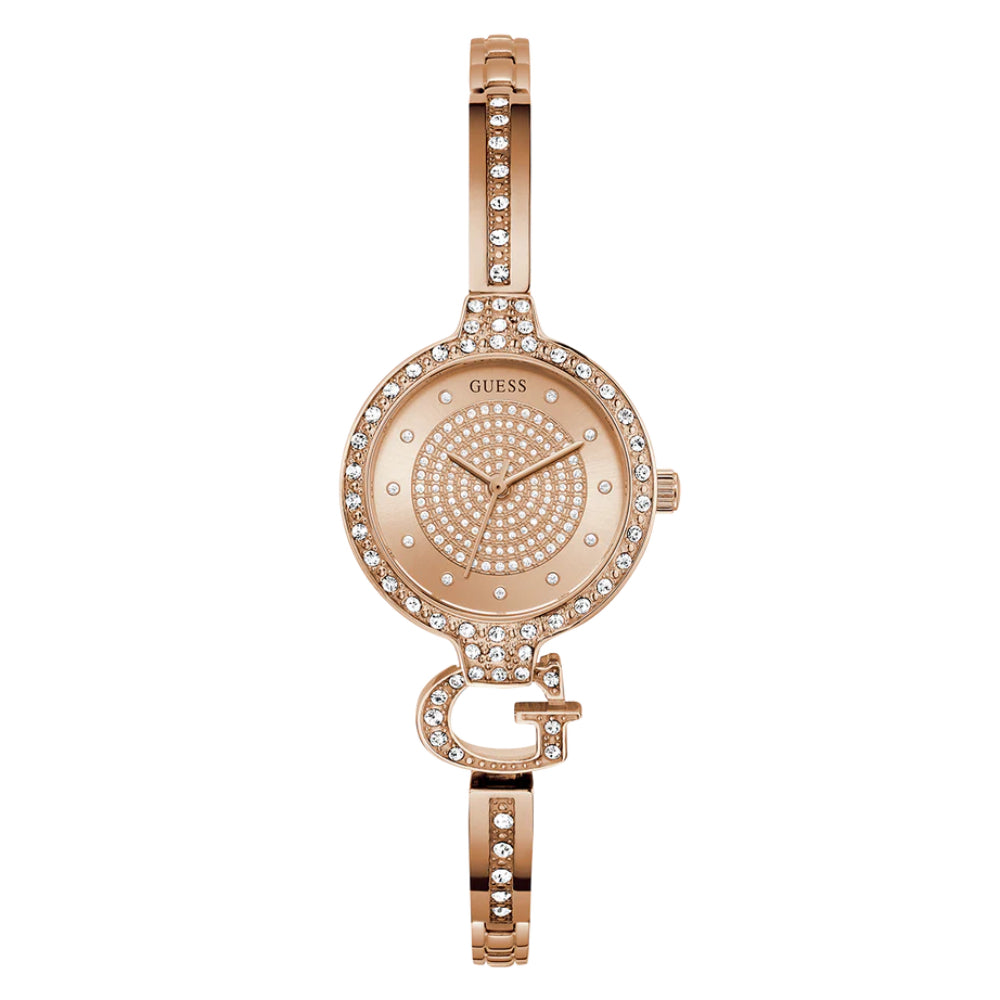 This petite 28 mm rose gold tone case is paired with a crystal bezel and a crystal rose gold tone "G" logo bangle that ties back beautifully to the glitzy rose gold dial. Self-adjustable G-links make it incredibly easy to get the perfect fit, whether worn alone or stacked with other jewelry, this logo bangle is sure to be a staple in your watch wardrobe!