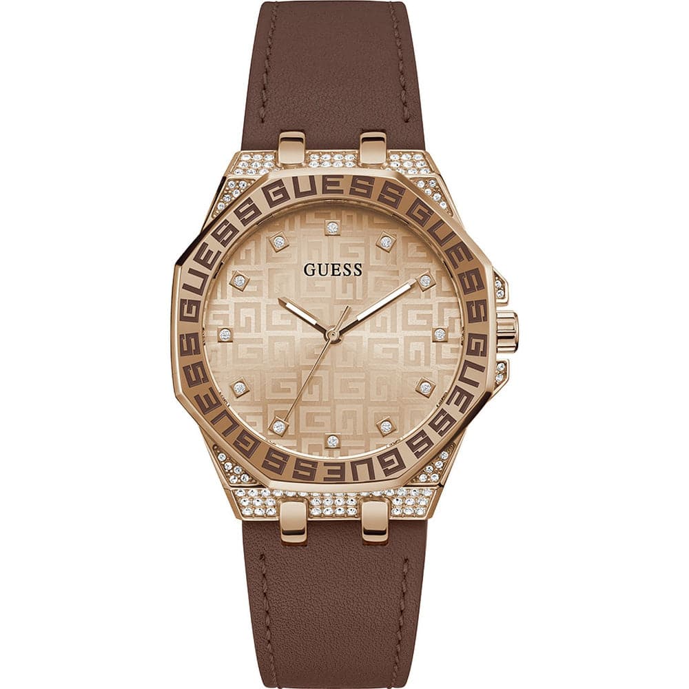 Guess GW0547L2 women's watch from the Insignia collection presents a brave design and classic colors. A design connecting a leather strap in a brown shade with a pink envelope and a shield of the same color is a proposal for ladies feeling well in current trends. The fashionable style is emphasized by the brand name appearing on the bezel. The ears of the housing and dials brighten the shimmering crystals.